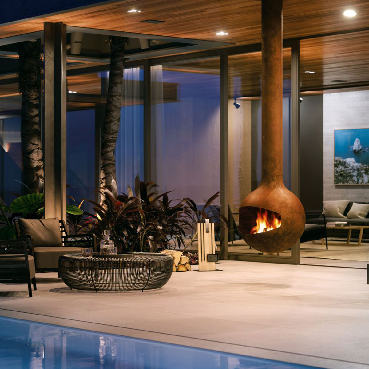 Outdoor model with a suspended and pivoting hearth.