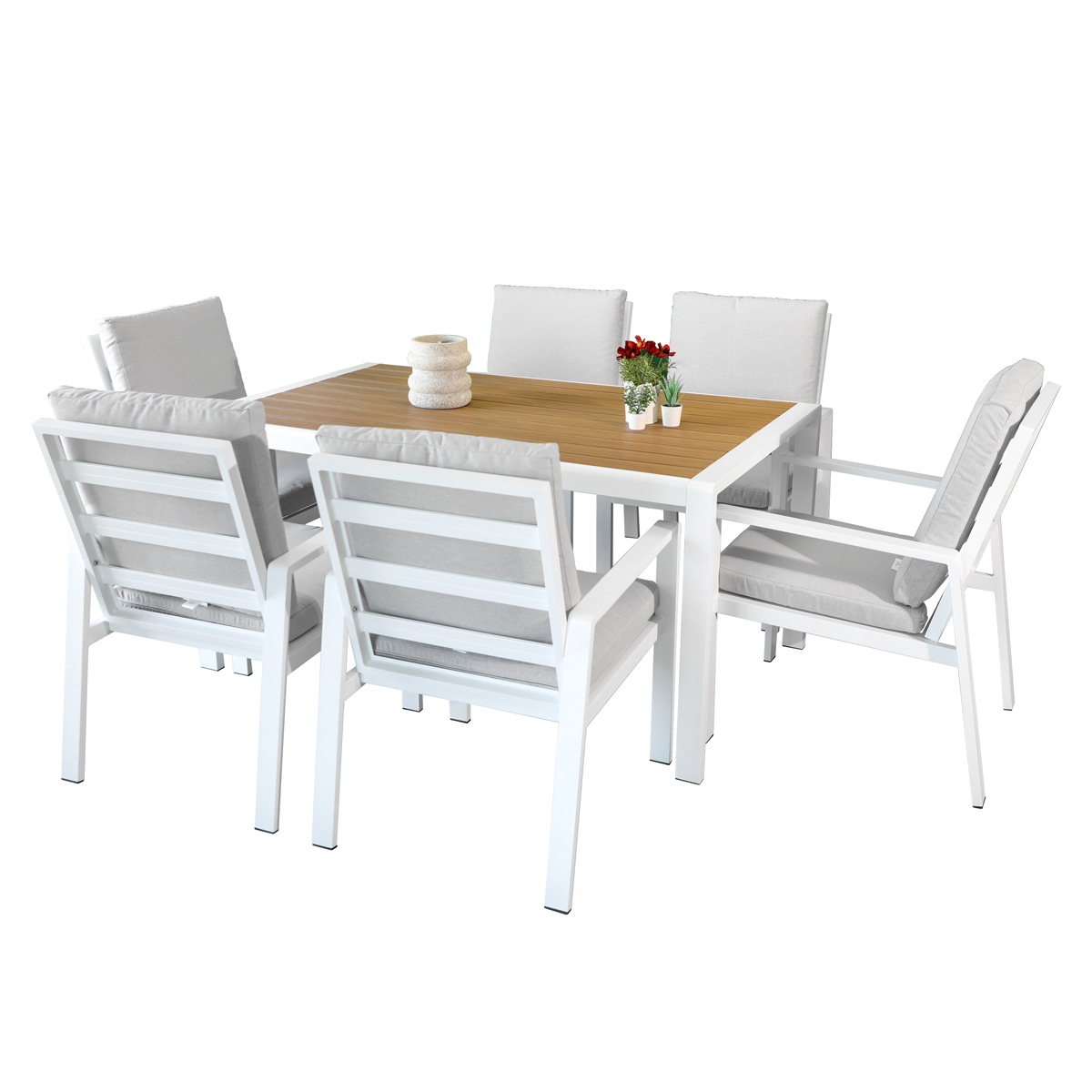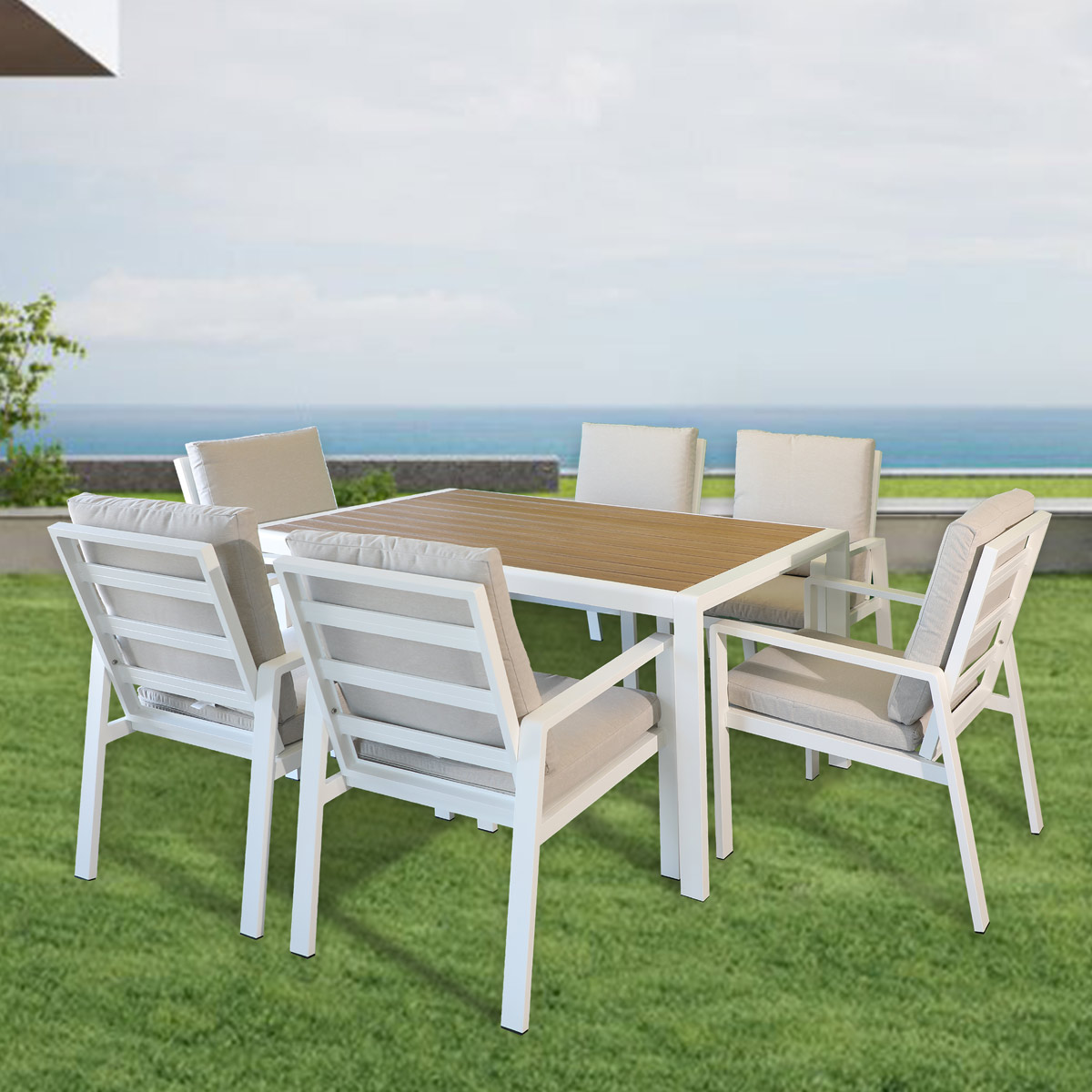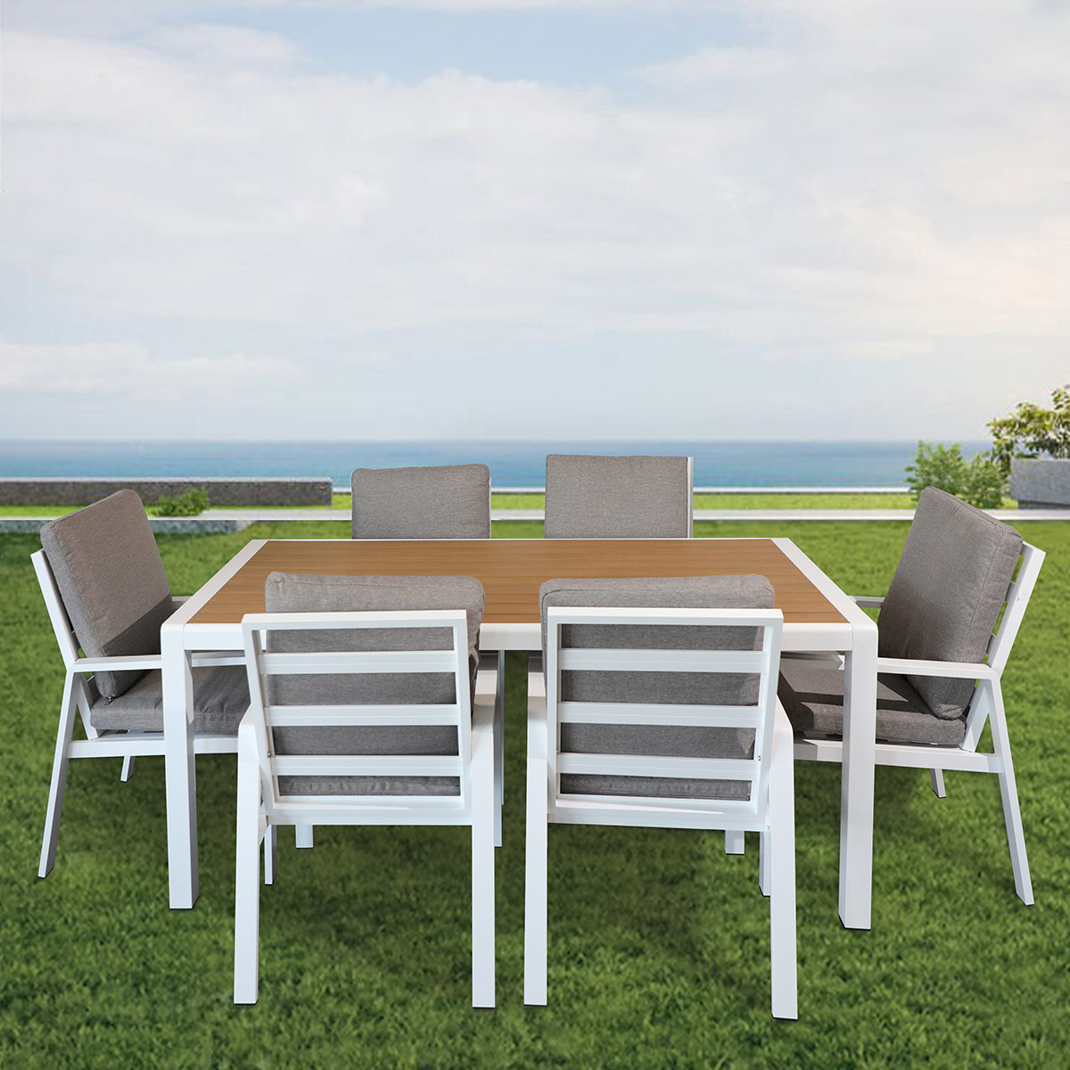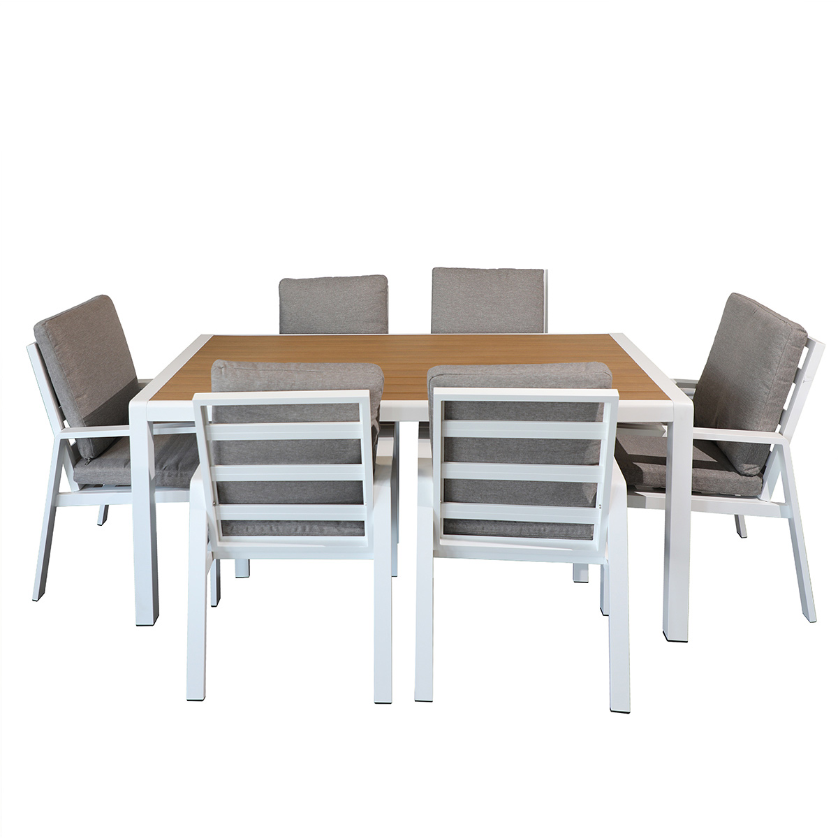 Dimension: W 80 x D 80 x H 73 cm Material: Aluminium Frame with powder coated and Plastic wood Color: