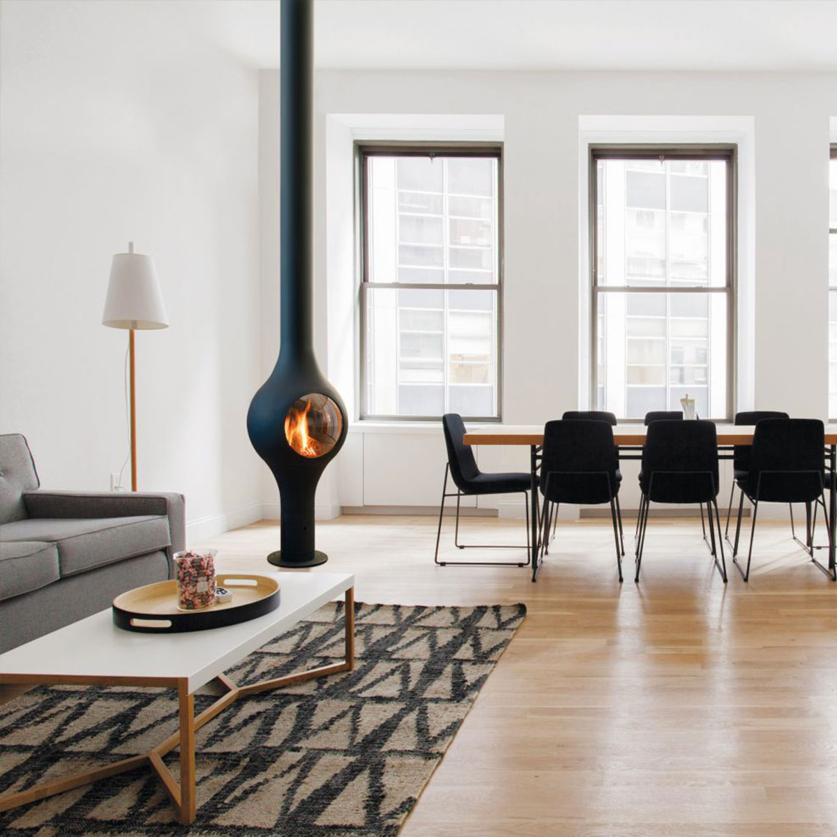 Suspended fireplace, fixed or pivoting.