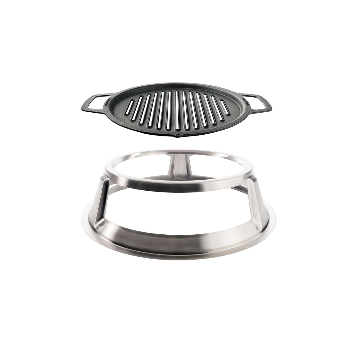 Sturdy cast iron grill with a stable base, ideal for grilling over an open flame.