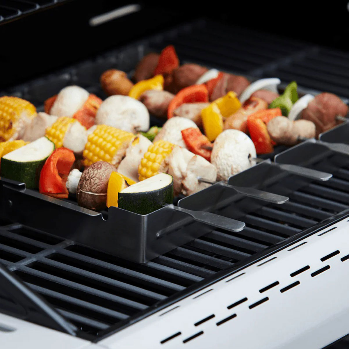 Brochettes on the barbecue, yummy! You stick to what you feel like and you get a versatile taste bomb. But how do you prepare them as efficiently as possible? With a BBQ kebab rack of course! A BBQ kebab rack clamps several skewers, making it extra easy to keep control. This way you can conjure up the best brochettes ever!