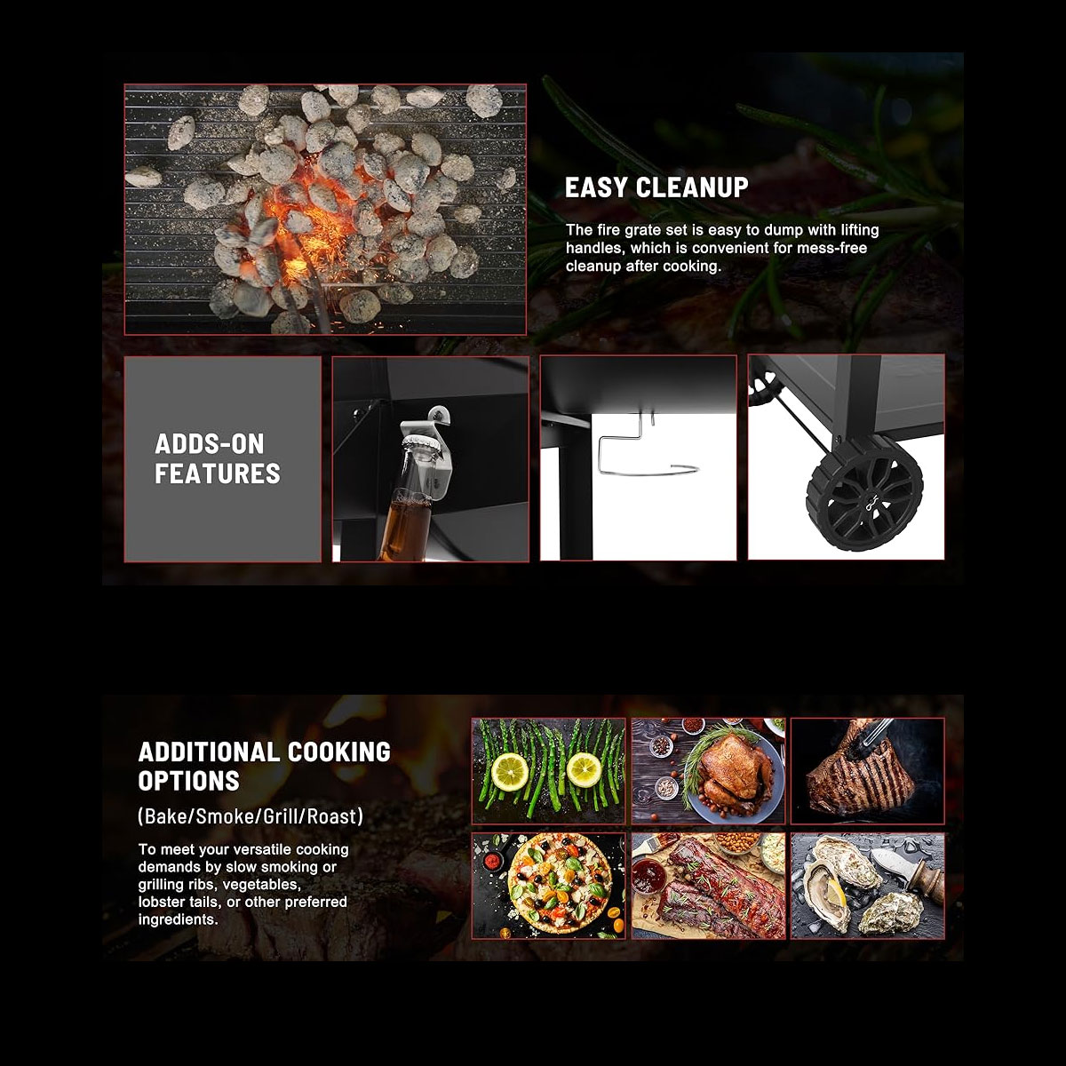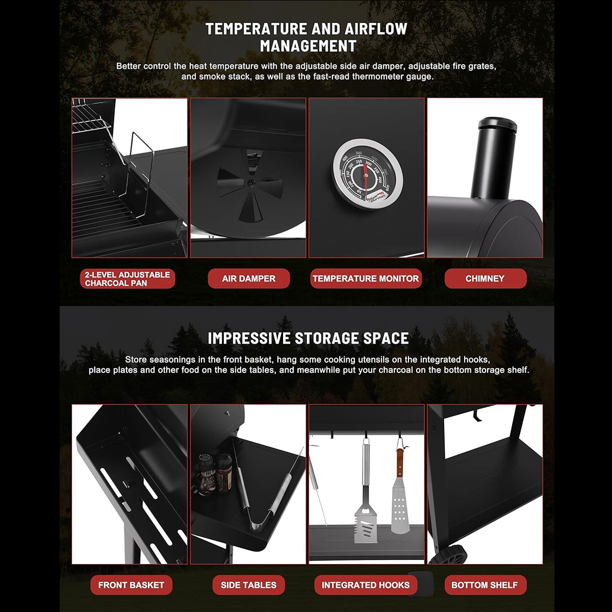 -Impressive Storage: Store seasonings in the front basket, hang some cooking utensils on the integrated hooks, place plates and other food on the side tables, and meanwhile put your charcoal on the bottom storage shelf