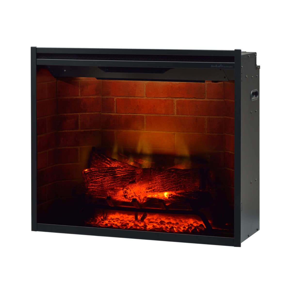 Revillusion is a completely new way of looking at fireplaces and changing the standard for electric fires. The plug-in electric firebox features our Revillusion technology with Realogs Plus a full grate of life-size hardwood cast logs. It includes built-in thermostat, on/off flame control and separate controls for flame speed, interior brightness and heater. A clear view through the lifelike flames captures the charm of a modern wood-burning fireplace. Change the mood of the room by customizing the firebox glow with a choice of warm hues and adjust the flame base red or blue great for all seasons.