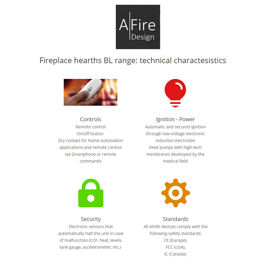 The spirit of the AFIRE inserts is an exclusive ecological and smart XL or XXL bio ethanol burner insert with embedded natural flames, with complete safety in the fire design space.