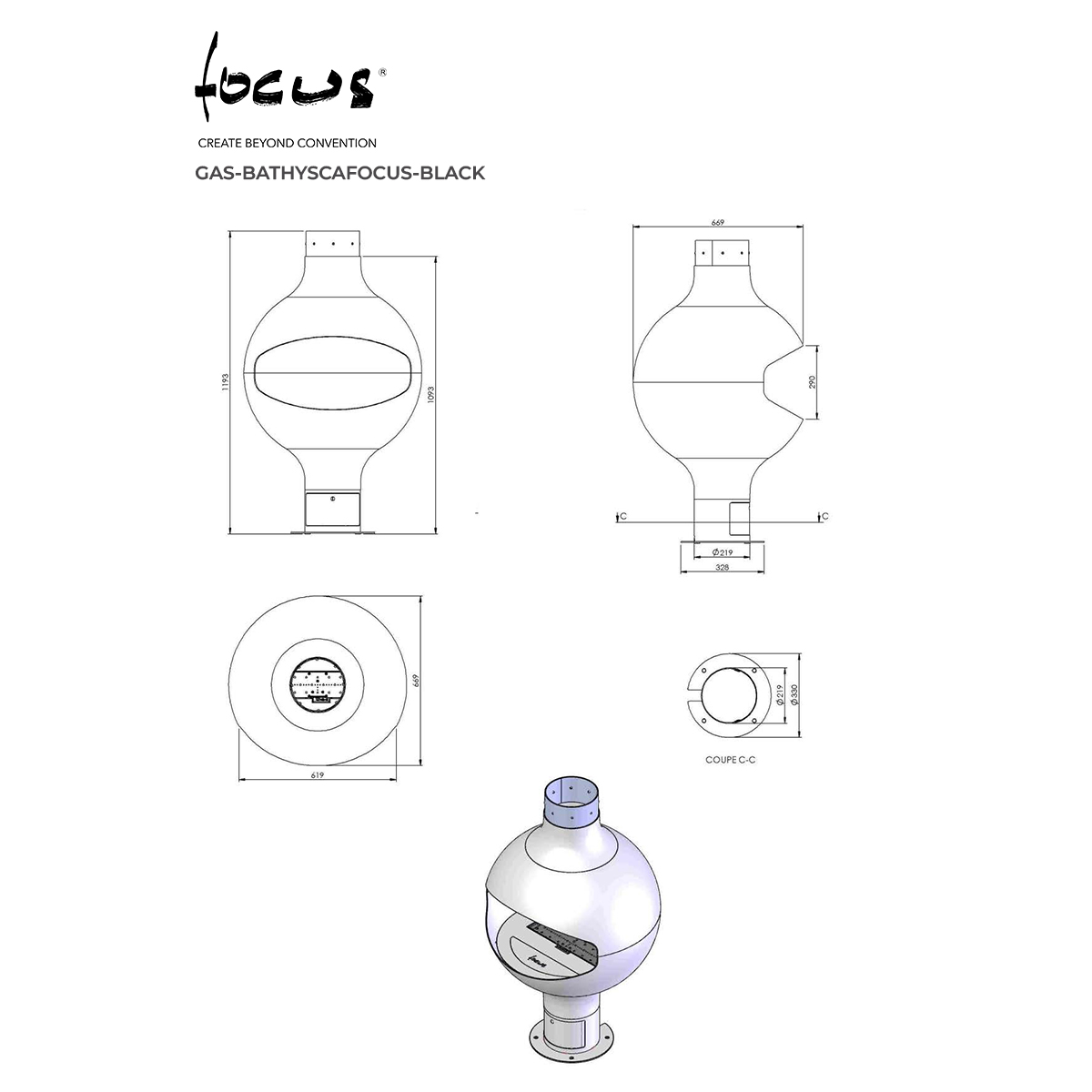 FOCUS FRANCE Gas Fire Central Bathyscafocus on base Black