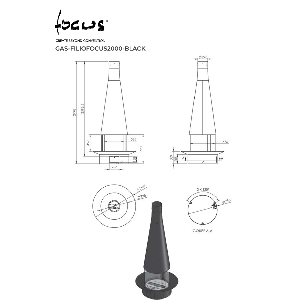 The Filiofocus features a tapering conical hood that is 1600 or 2000 mm in length and a hearth base holding a fire bowl protected by four curved panels of heat-resistant glass, two of which slide open to create a single opening at the front.