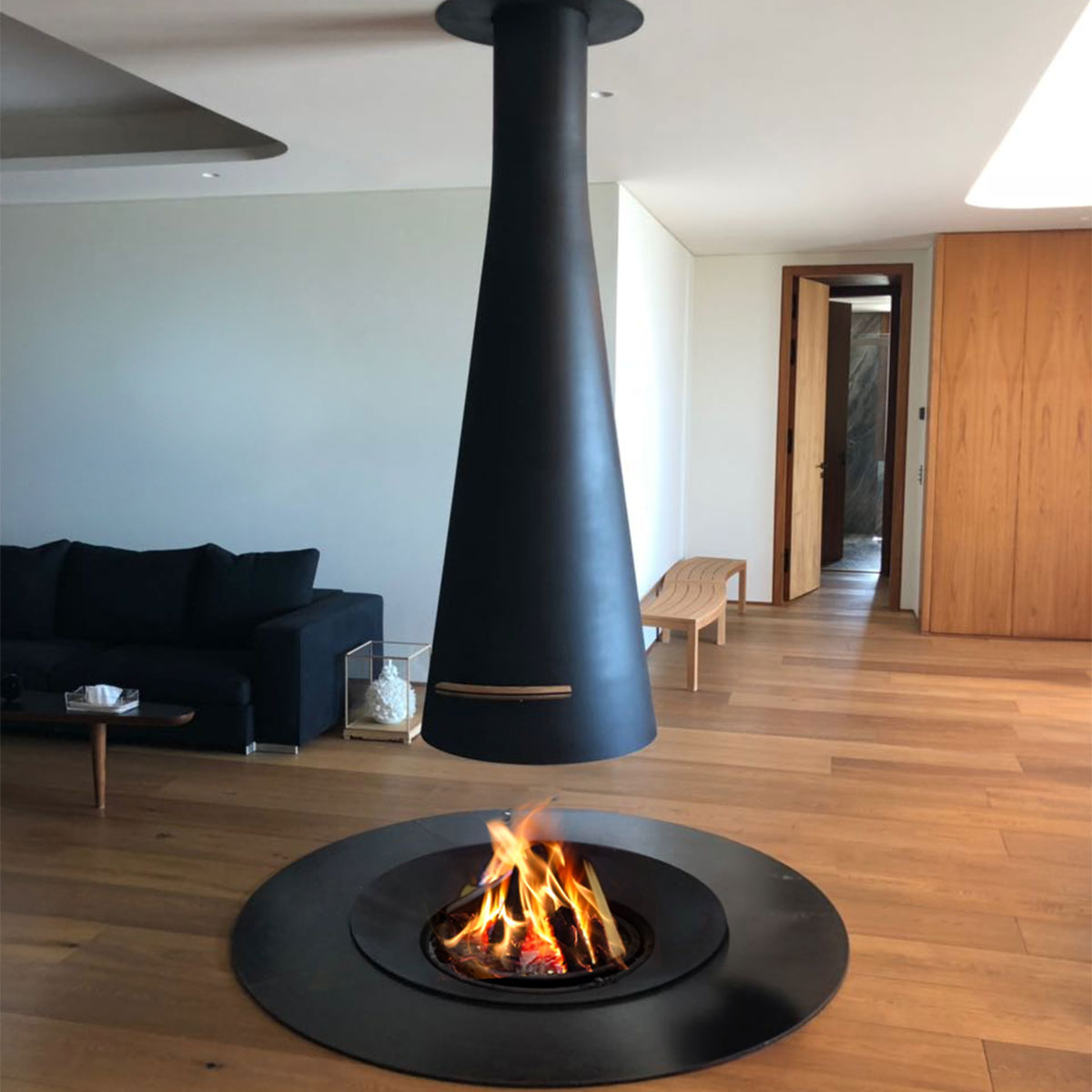 The Filiofocus features a tapering conical hood that is 1600 or 2000 mm in length and a hearth base holding a fire bowl protected by four curved panels of heat-resistant glass, two of which slide open to create a single opening at the front.