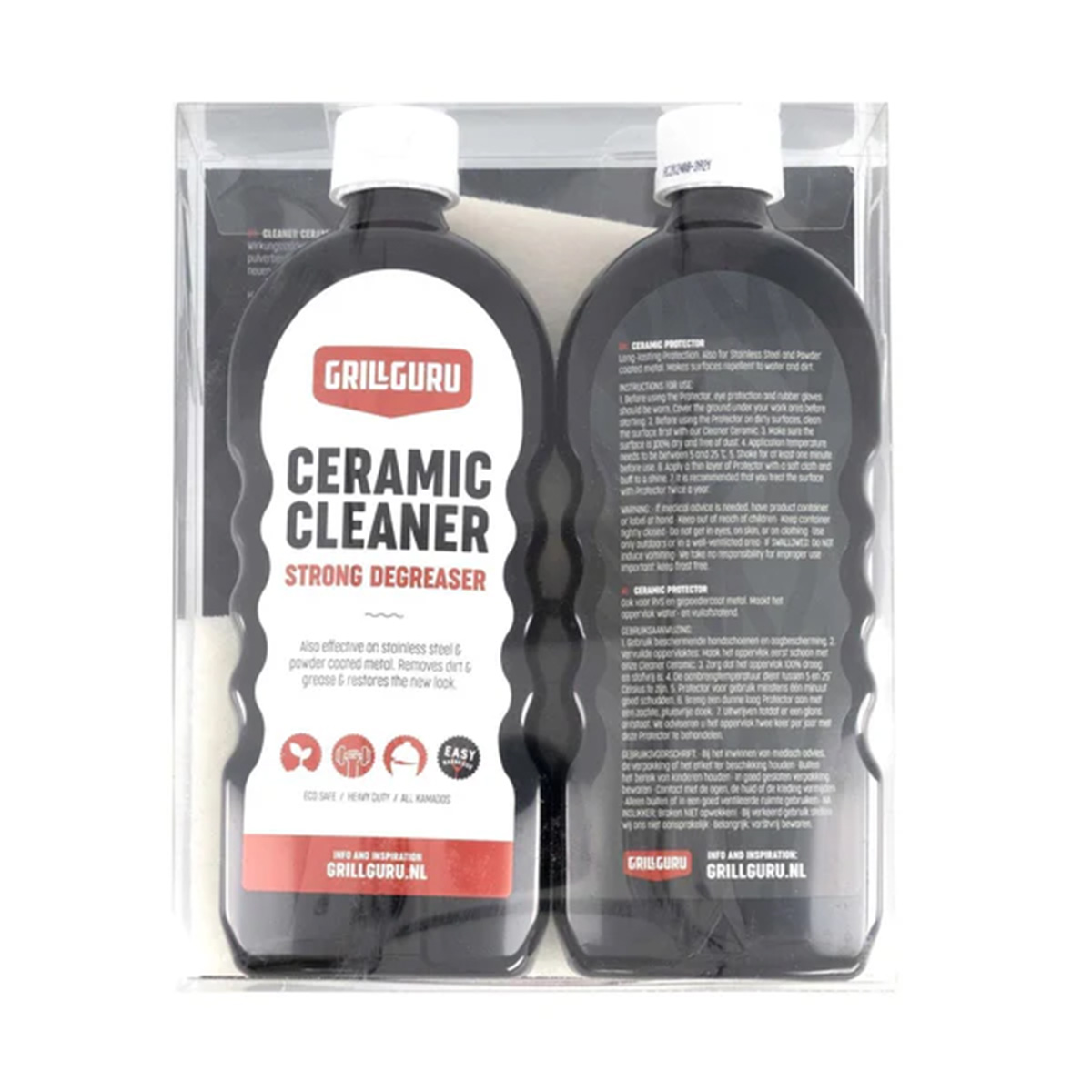 The Grill Guru Ceramic cleaning set is a handy care kit that contains Cleaner 500 ML and Protector 500 ml as well as a cloth and scouring pad.