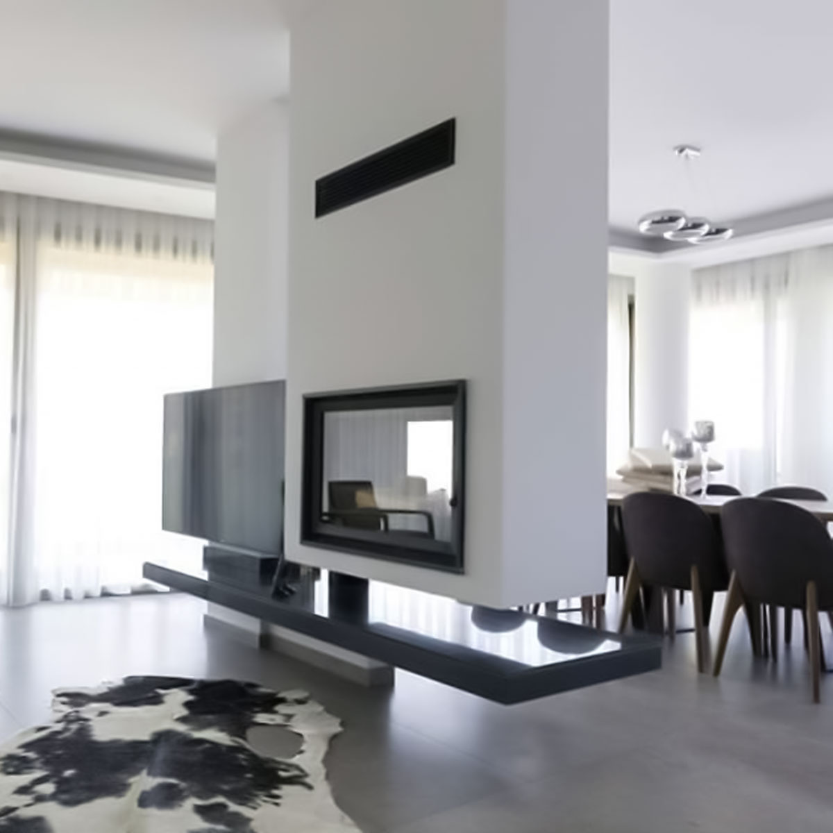 Elegance and warmth unite: Sleek, panoramic Wood Fire Tunnel.