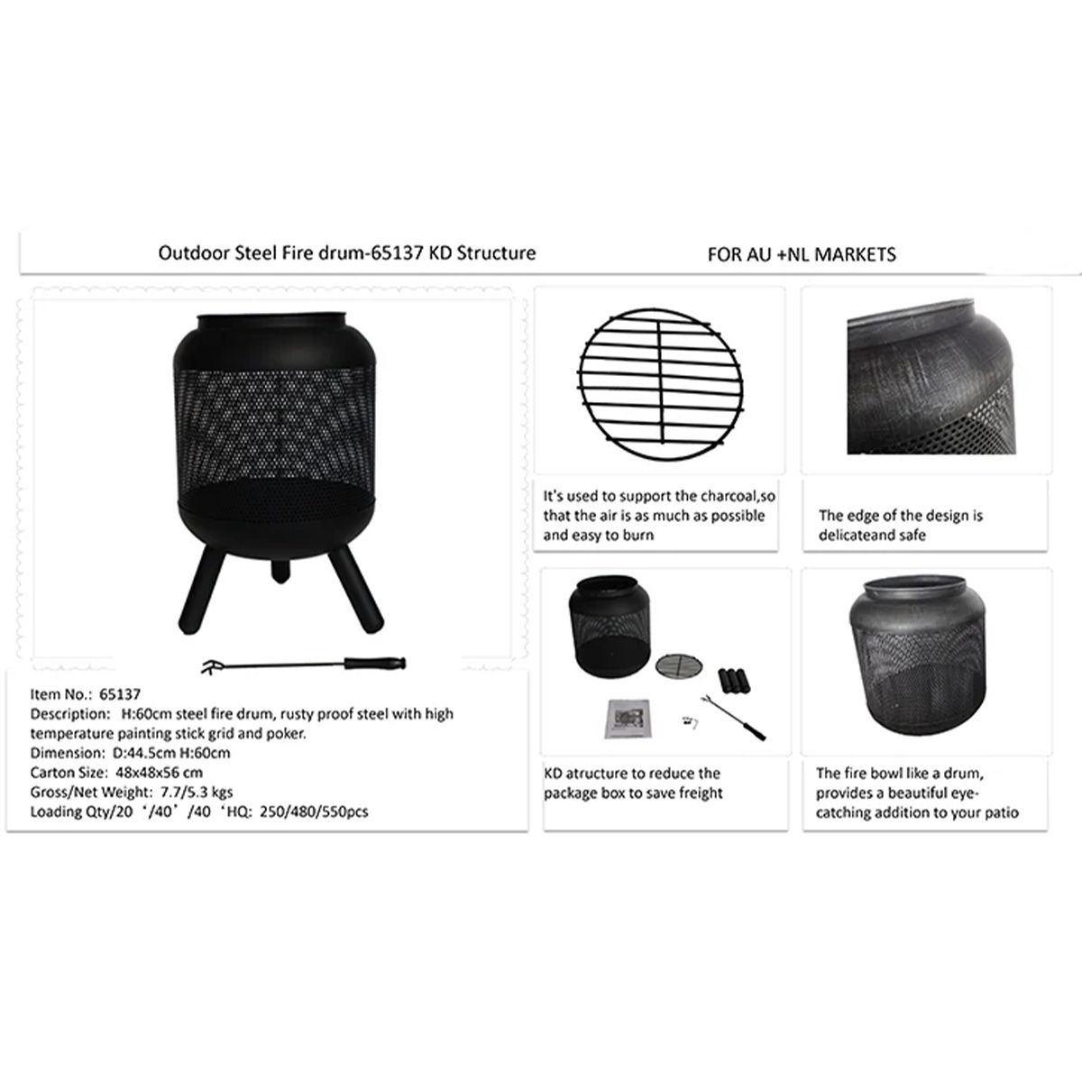 60cm steel fire drum, rusty proof steel with high temperature painting stick grid and poker, with chromed BBQ grill.