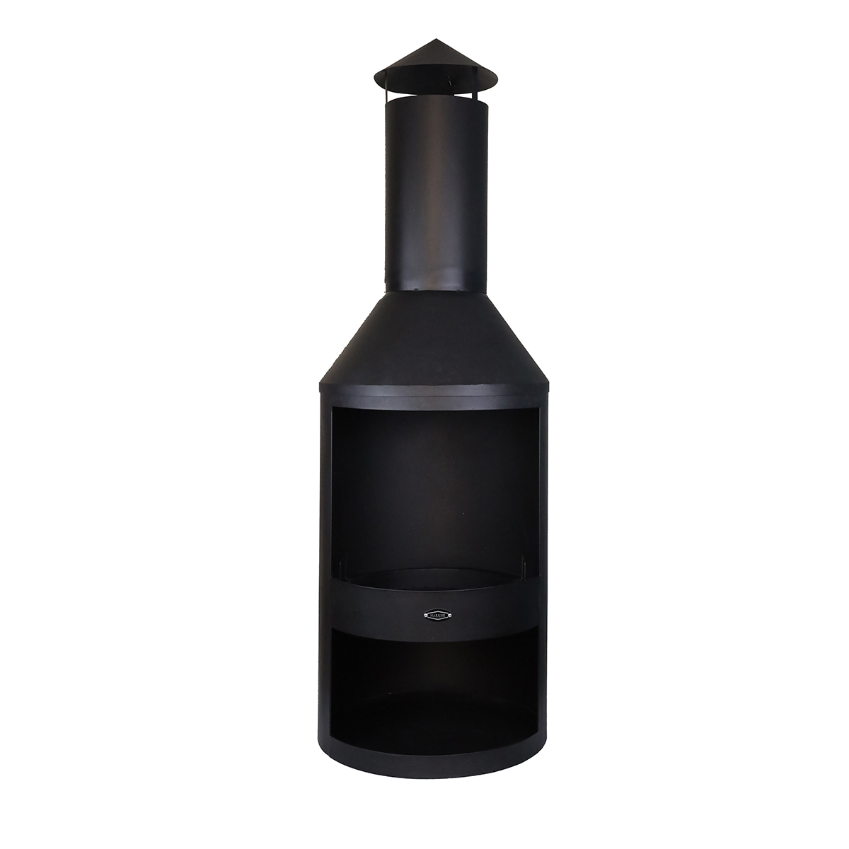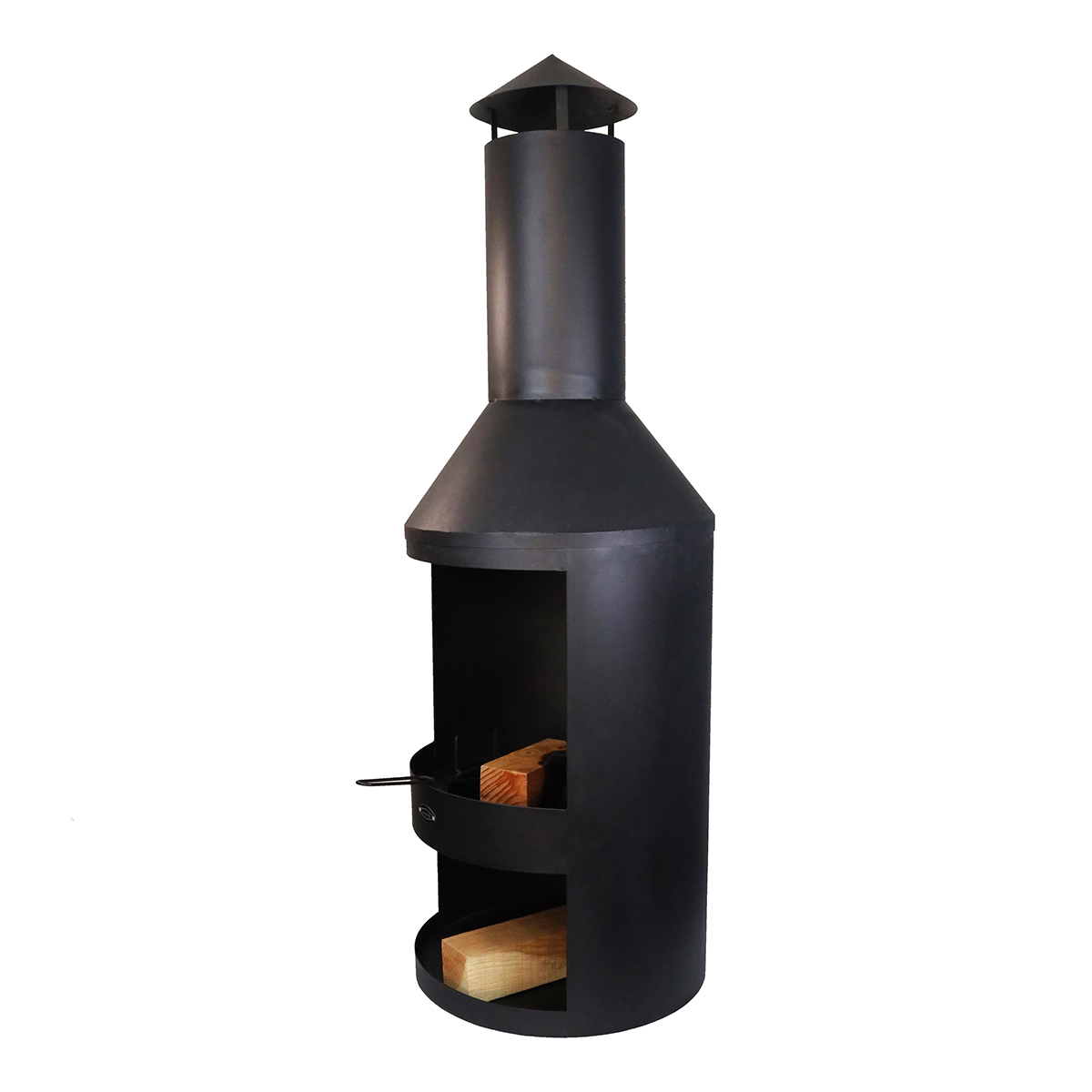 Steel chiminea with a modern, minimalistic appearance. The backyard chimney fire pit has log storage, so your logs can remain close by. Large chiminea comes with a poker & log chiminea grate. Optional cover upgrade available to further protect your chiminea fire pit when not in use.