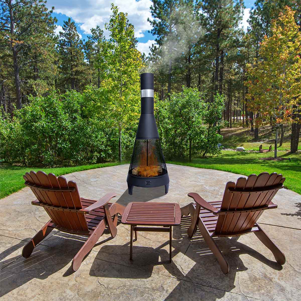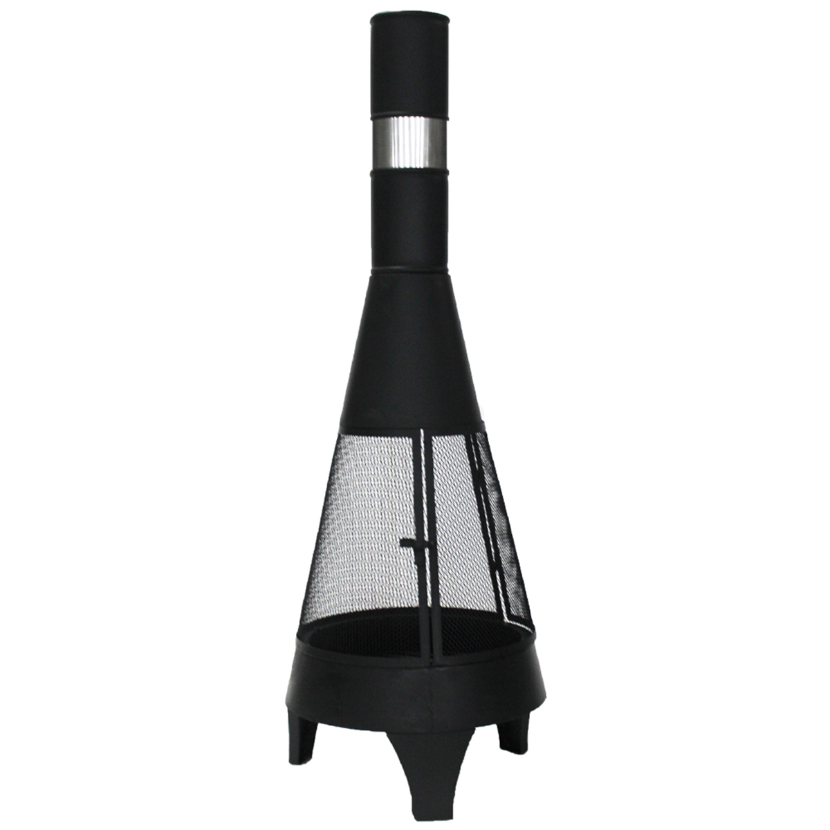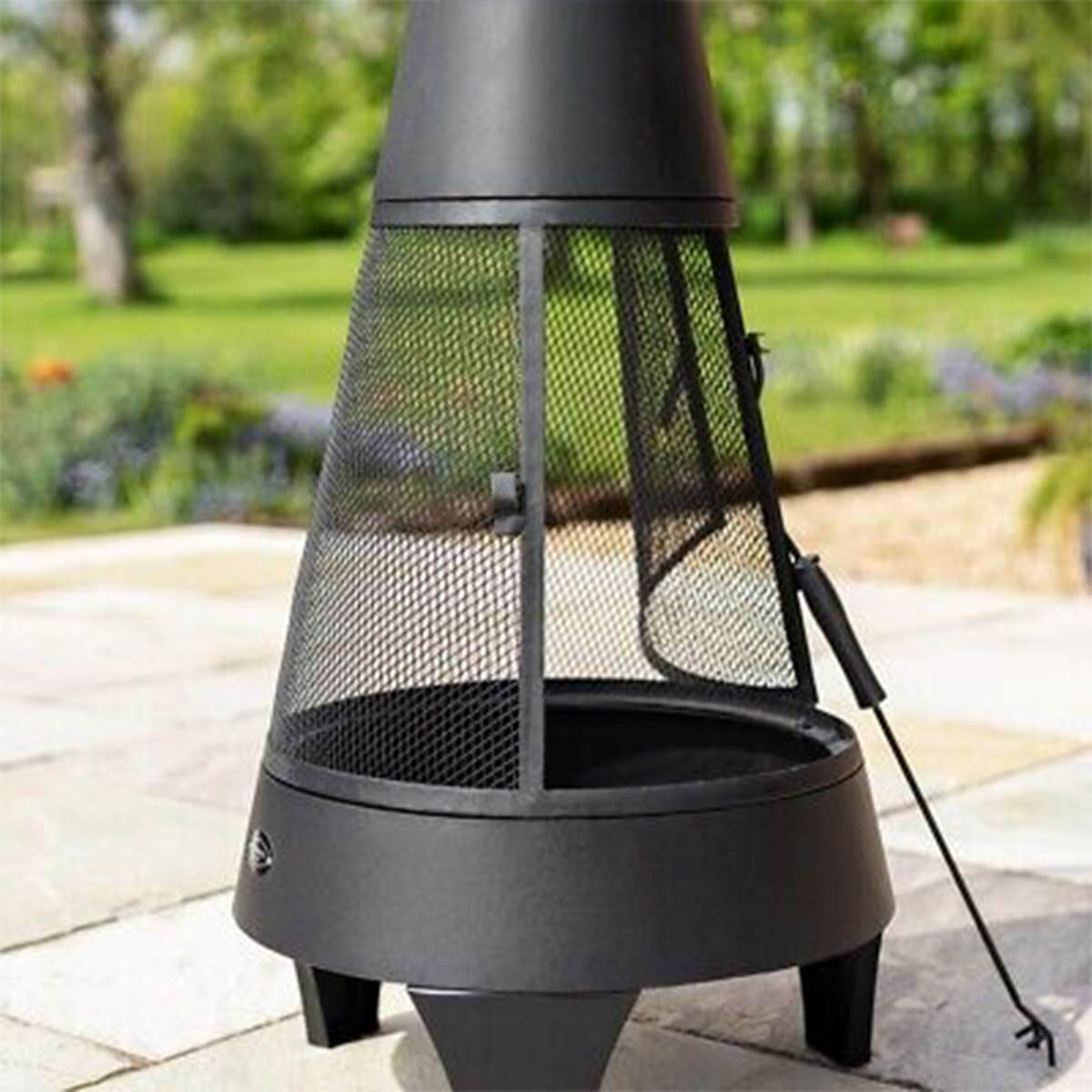 125cm H steel outdoor chimenea with stick grid, steel pan, spark screen and poker included.