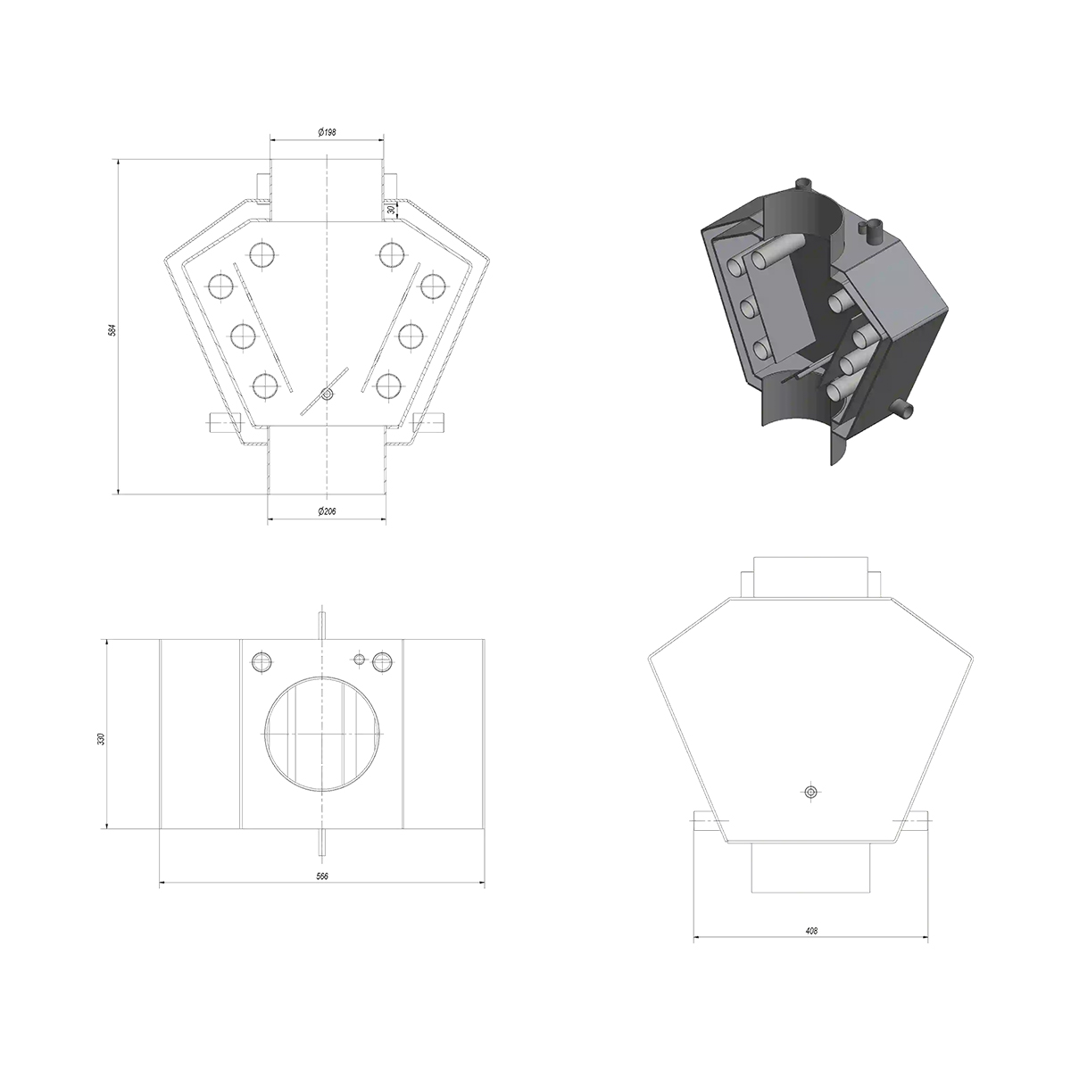 The central part of the exchanger is the internal chamber in which the system of tubes and ducts increases the heat exchange surface. At the inlet of the chamber, a movable plate is mounted which ensures proper arrangement of the damper.