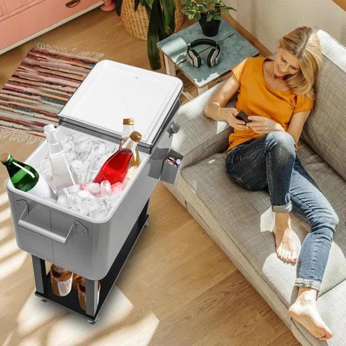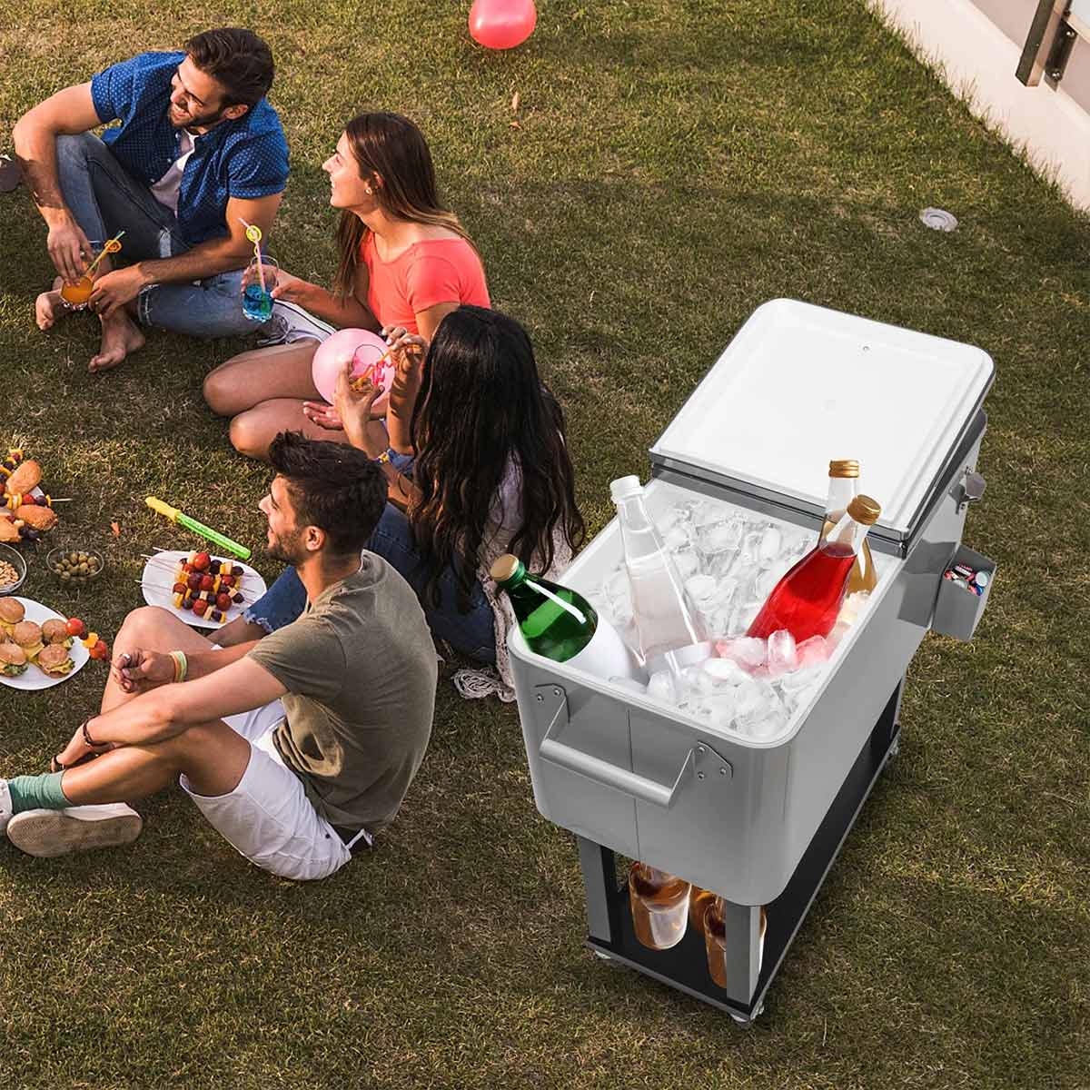 It keeps drinks perfectly chilled for indoor or outdoor entertaining. Equipped with a bottle opener, cap catcher, and wheels for easy transport, it ensures a hassle-free experience. The water and UV resistant cover protect the cooler during storage, maintaining its sleek look. Never worry about warm drinks again and enjoy endless fun with family and friends, thanks to this stylish and efficient cooler. Get ready to entertain in style!
