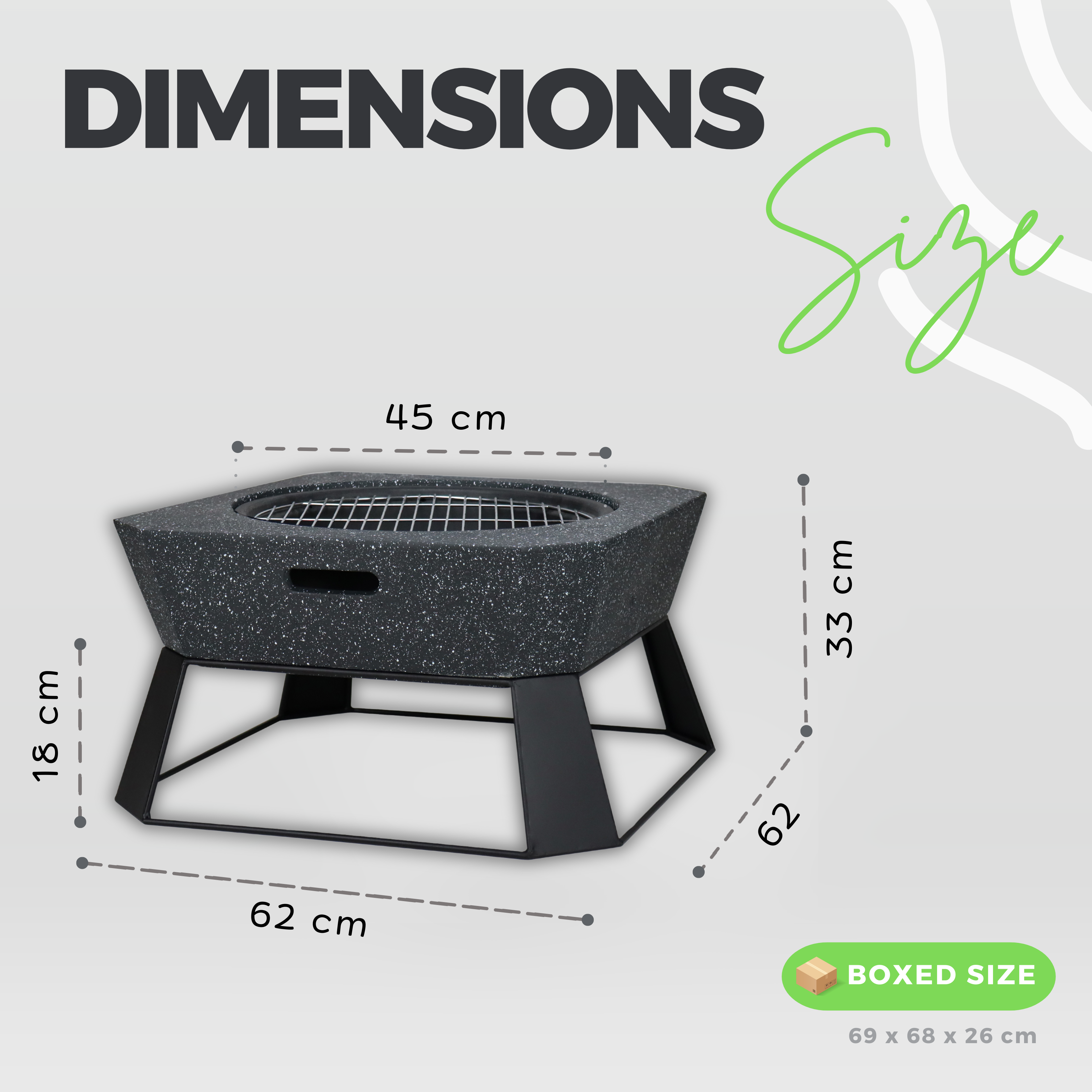 Introducing the MGO Fire Pit with Chrome Grill Rack, a versatile and stylish addition to your outdoor space. Perfect for both warmth and cooking, this fire pit allows you to place your food on the chrome grill rack above the fire logs for a quick and delicious barbecue experience. Crafted from durable magnesium oxide (MGO), it boasts a sleek, modern concrete look while being lightweight and easy to move, making it a practical choice for any garden or patio setup.
