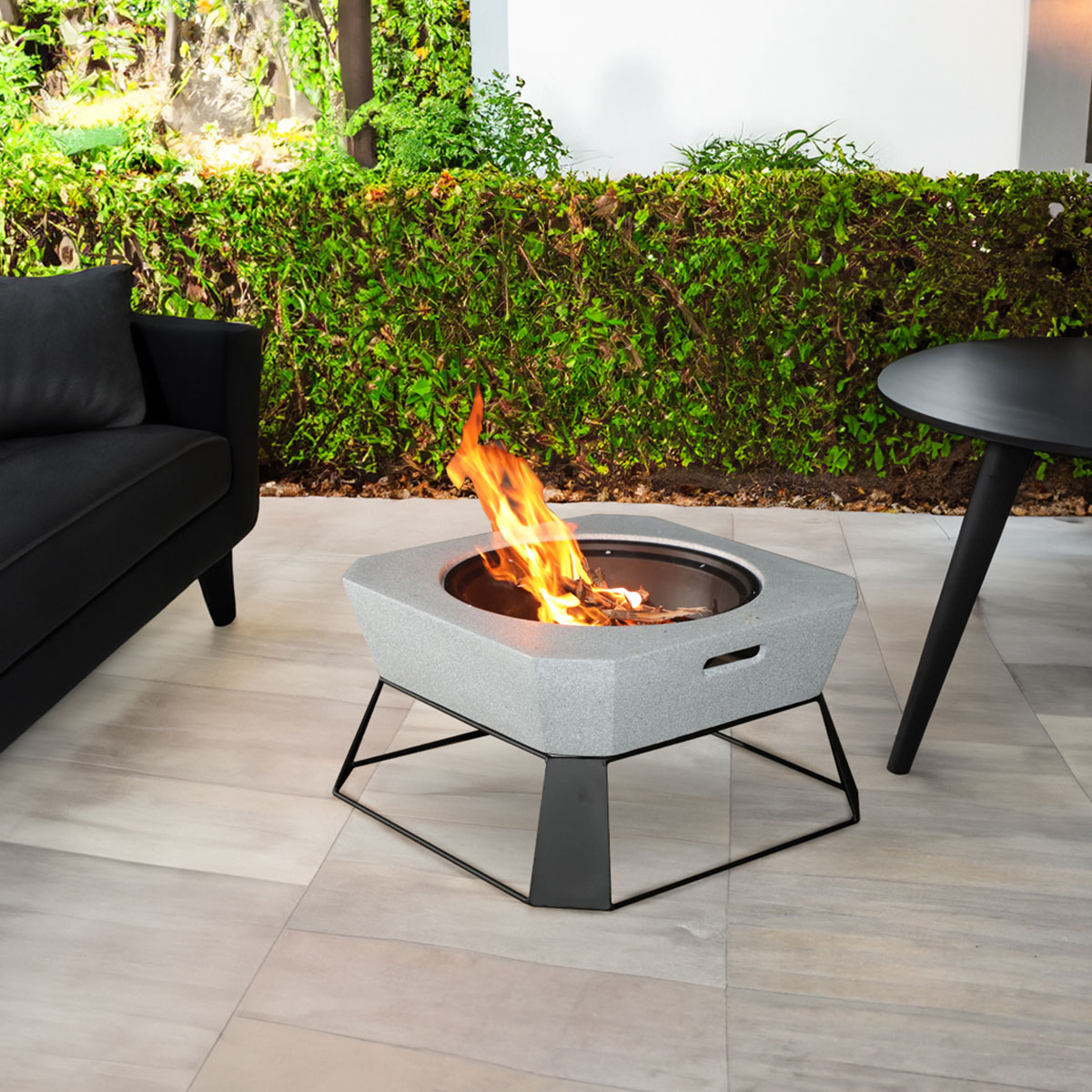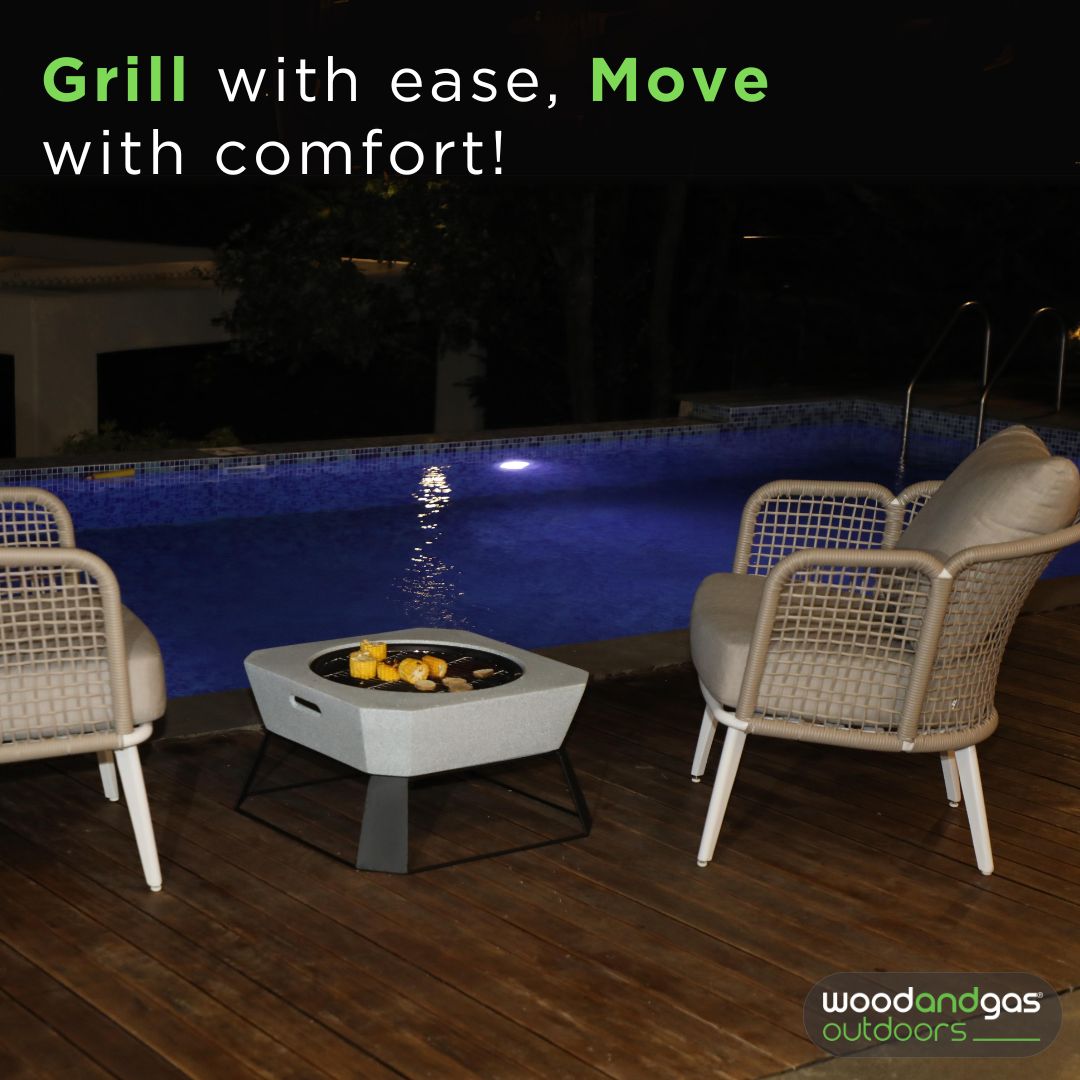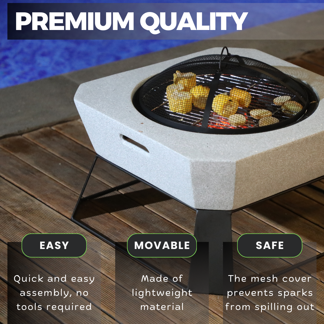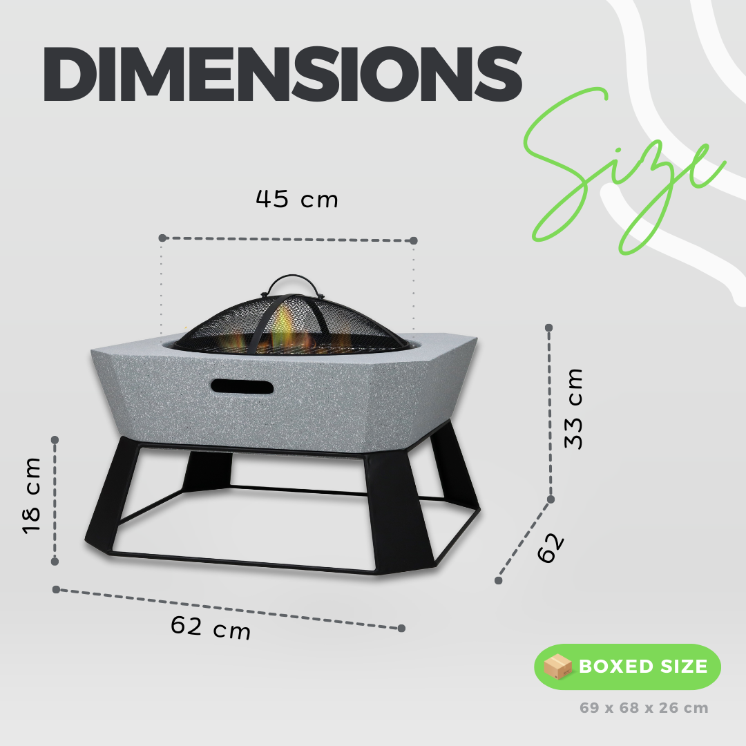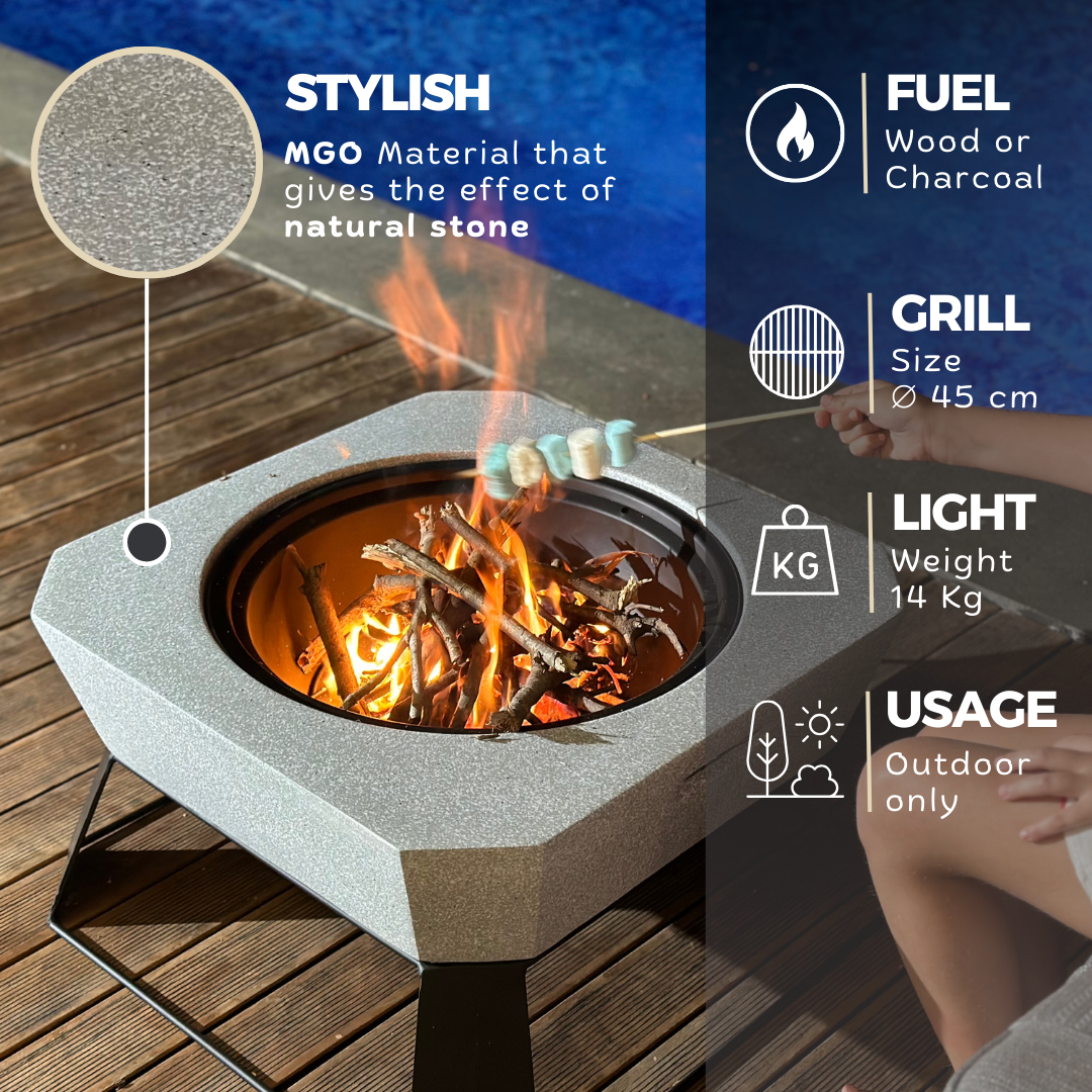 Introducing the MGO Fire Pit with Chrome Grill Rack, a versatile and stylish addition to your outdoor space. Perfect for both warmth and cooking, this fire pit allows you to place your food on the chrome grill rack above the fire logs for a quick and delicious barbecue experience. Crafted from durable magnesium oxide (MGO), it boasts a sleek, modern concrete look while being lightweight and easy to move, making it a practical choice for any garden or patio setup.