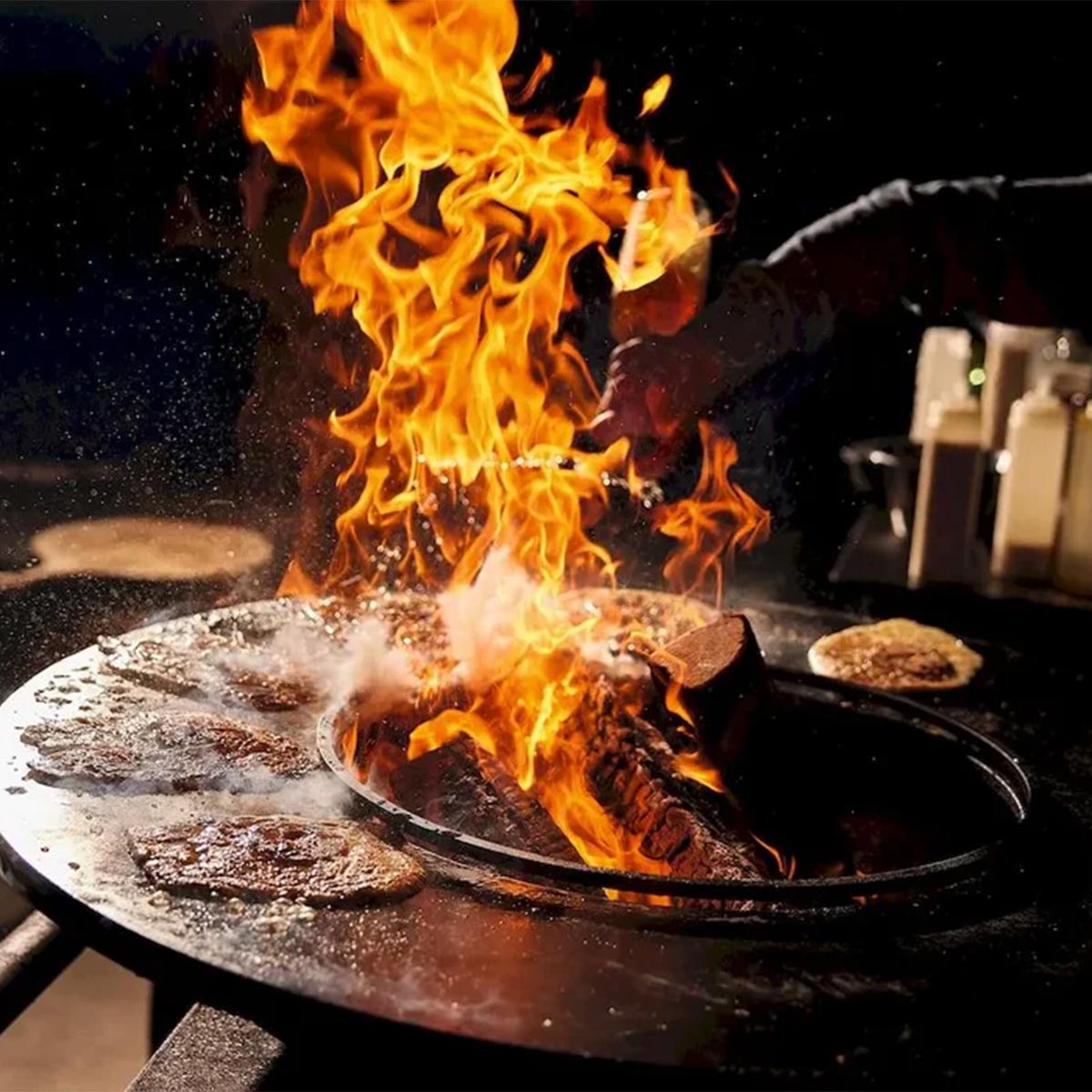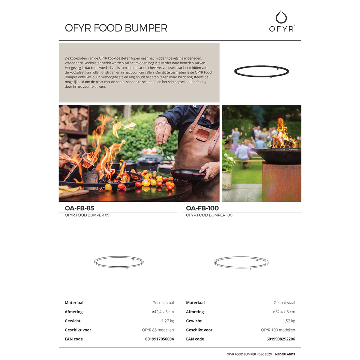 The cooking plates of the OFYR cooking units run slightly downward towards the center. When the cooking plates are heated, the center will drop a little further down. The result is that around food such as tomatoes, but also very fatty food can roll or slide to the center of the cooking plate and fall into the fire. To avoid this, the OFYR Food Bumper has been developed. The raised steel rim stops the food but still offers the possibility to scrape the cooking plate clean with the spatula and push the scrape under the rim into the fire.