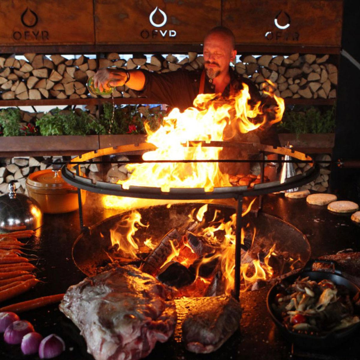 Barbecue fans will love this set of three steel skewers on a specially designed stand. Placed over OFYR XL cooking unit’s fire, the heightened stand with notched ring is just the right height for meat and vegetables to cook to perfectioned ring is just the right height for meat and vegetables to cook to perfection. Available for OFYR 100-100 models. The horizontal Skewer Ring 100 and Skewer 85 (set of 3) are also available as individual parts.