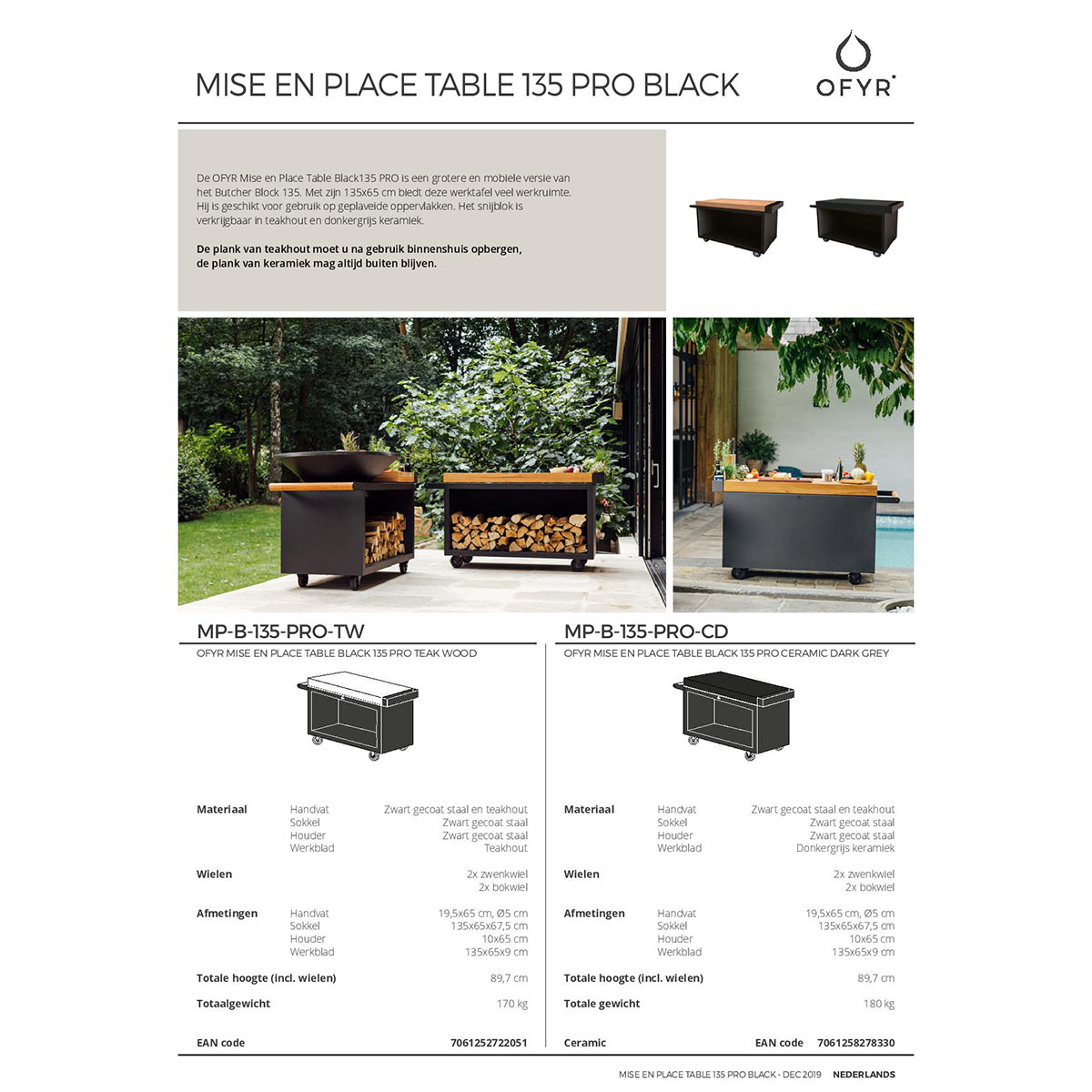 The OFYR Mise En Place Table Black 135 PRO is incredibly handy to use with your cooking unit, allowing you more space to prepare your food. With the 135×65 cm, there is ample working space. The chopping board is available in teak wood and dark grey ceramic.
