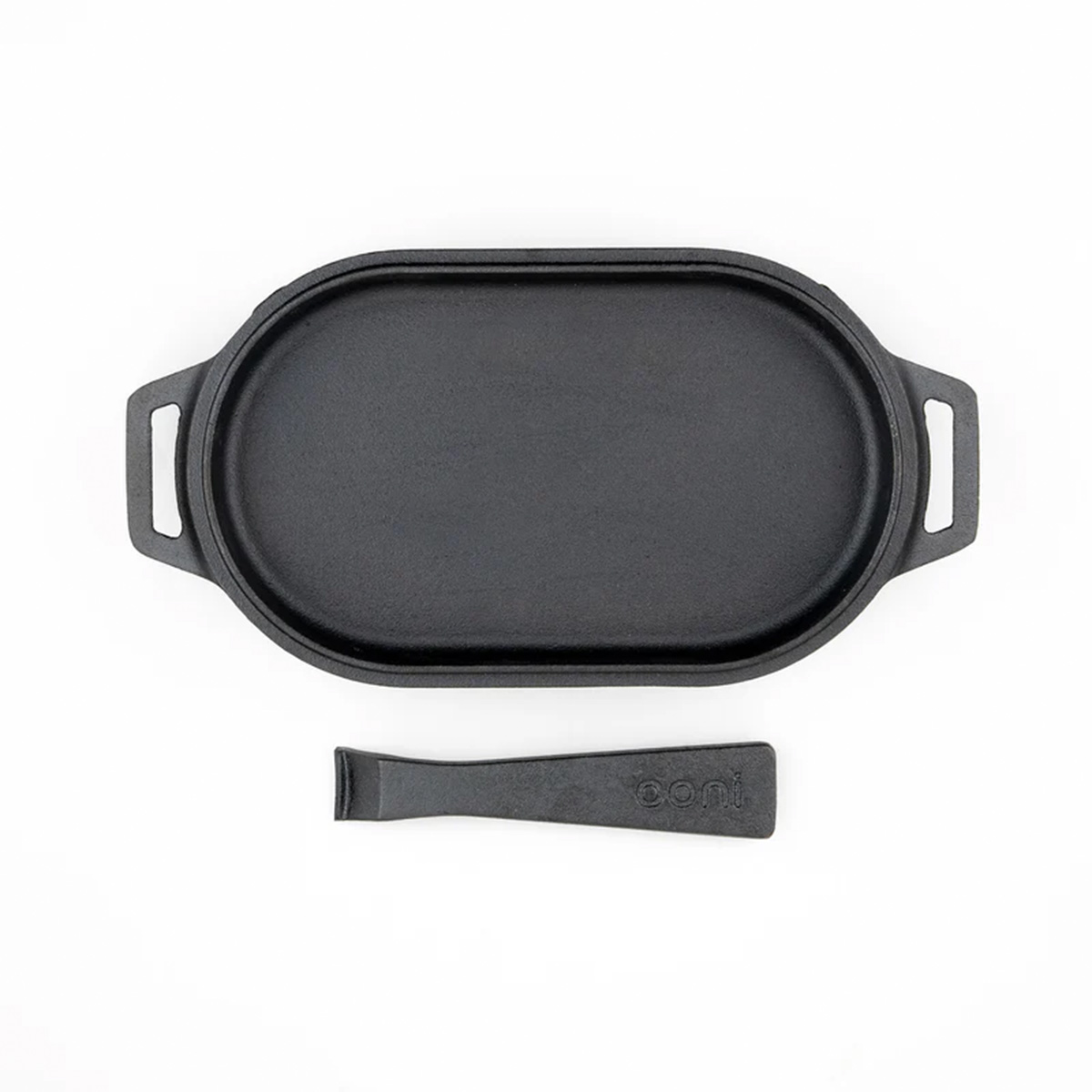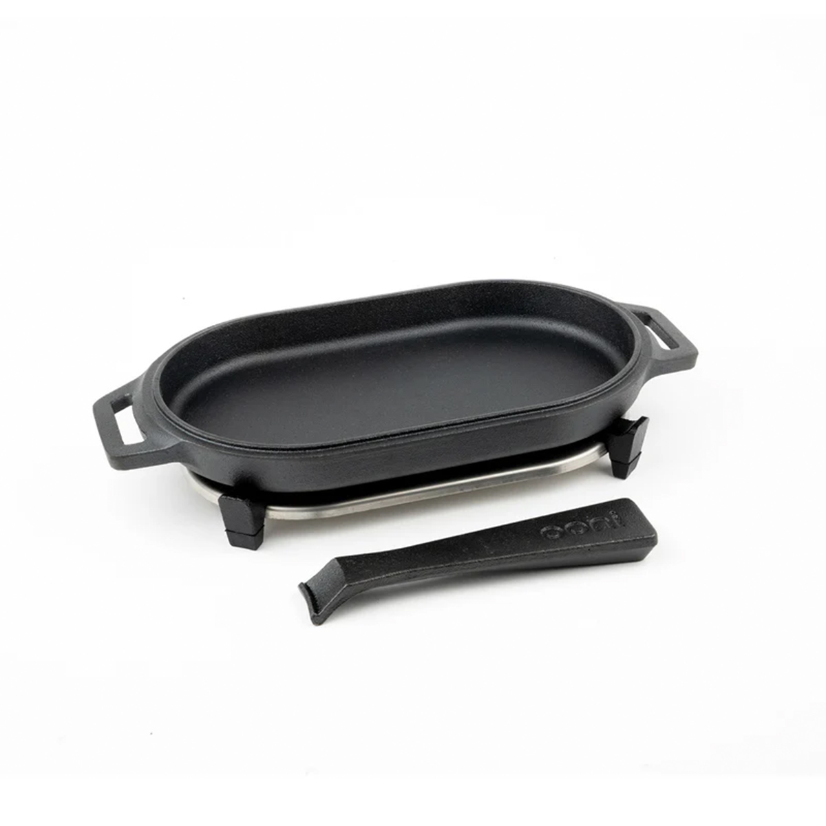 Cast iron sizzler pan and handle with a stainless-steel base. Superb heat retention for efficient cooking! Perfect for cooking meat, seafood, vegetables and much more in your Ooni pizza oven. The unique handle design is removable and comfortable to use, making it easy to get sizzling hot food straight from your oven to the table.