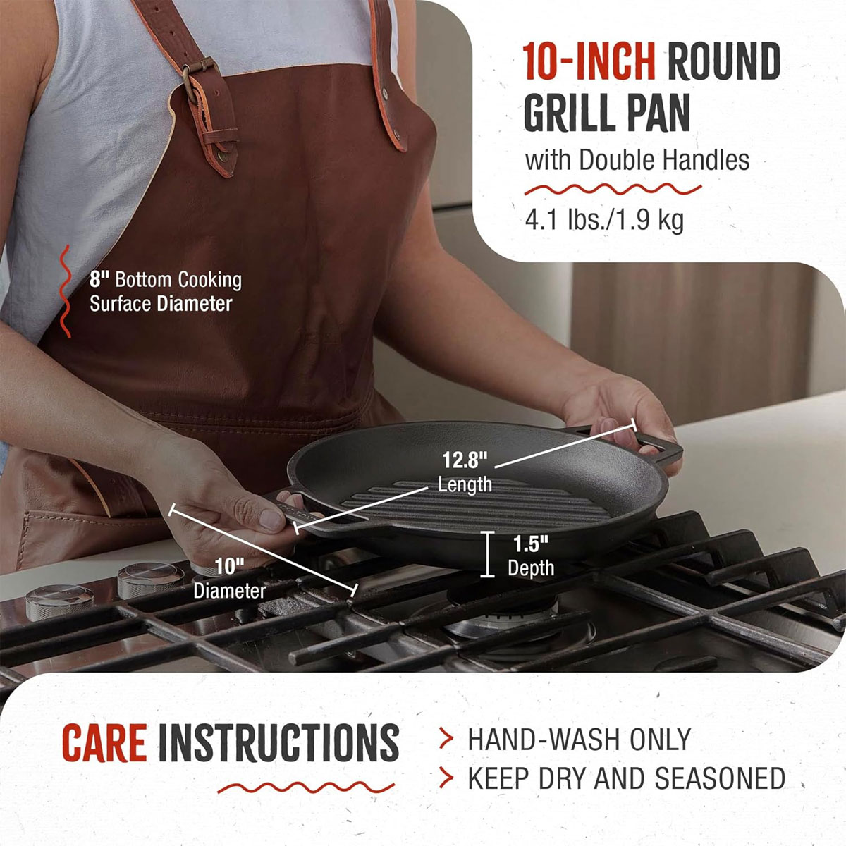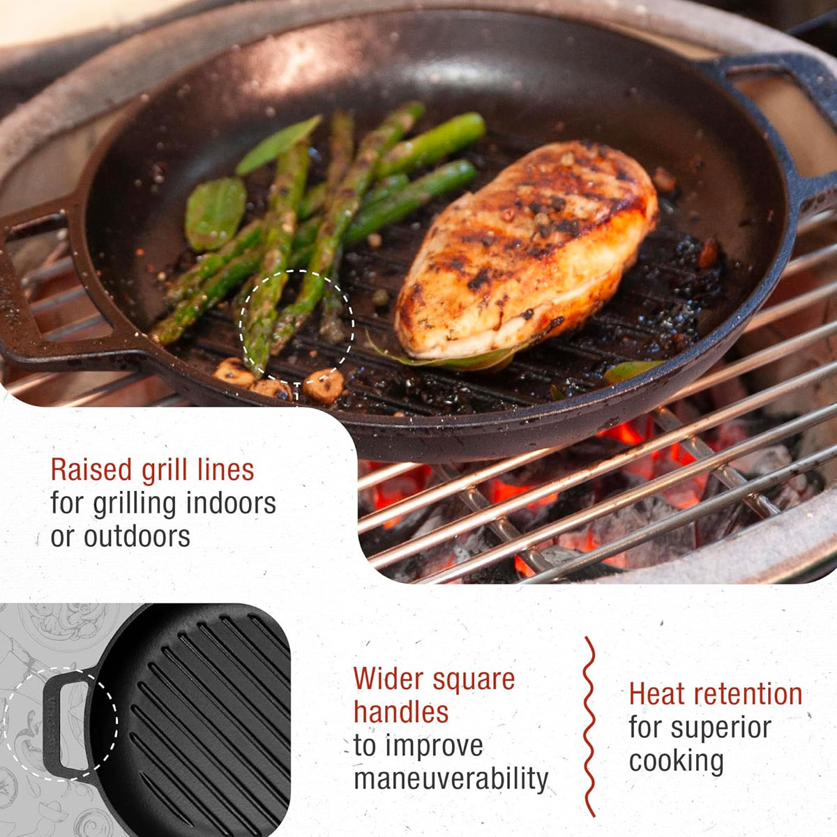 Our high-quality cast iron grill pan is seasoned with non-GMO, Kosher-certified flaxseed oil and is PTFE- and PFOA-free for better food. Plus, the textured engineered surface maintains seasoning better than milled-smooth pans