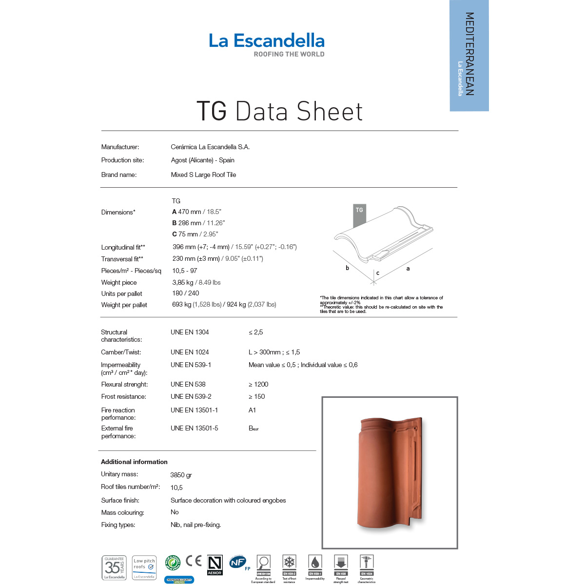 A double curvature mixed “S” roof tile where eaves and ridge tiles assure to design and functionality to provide easy-to-install roofs with the special characteristic beauty of the Mediterranean roofs.