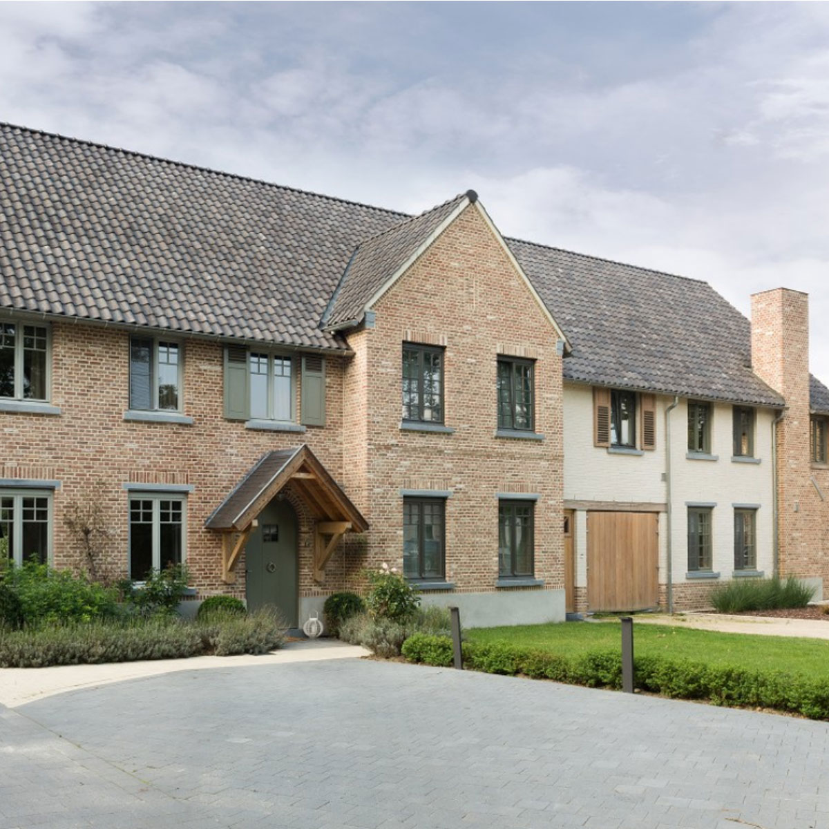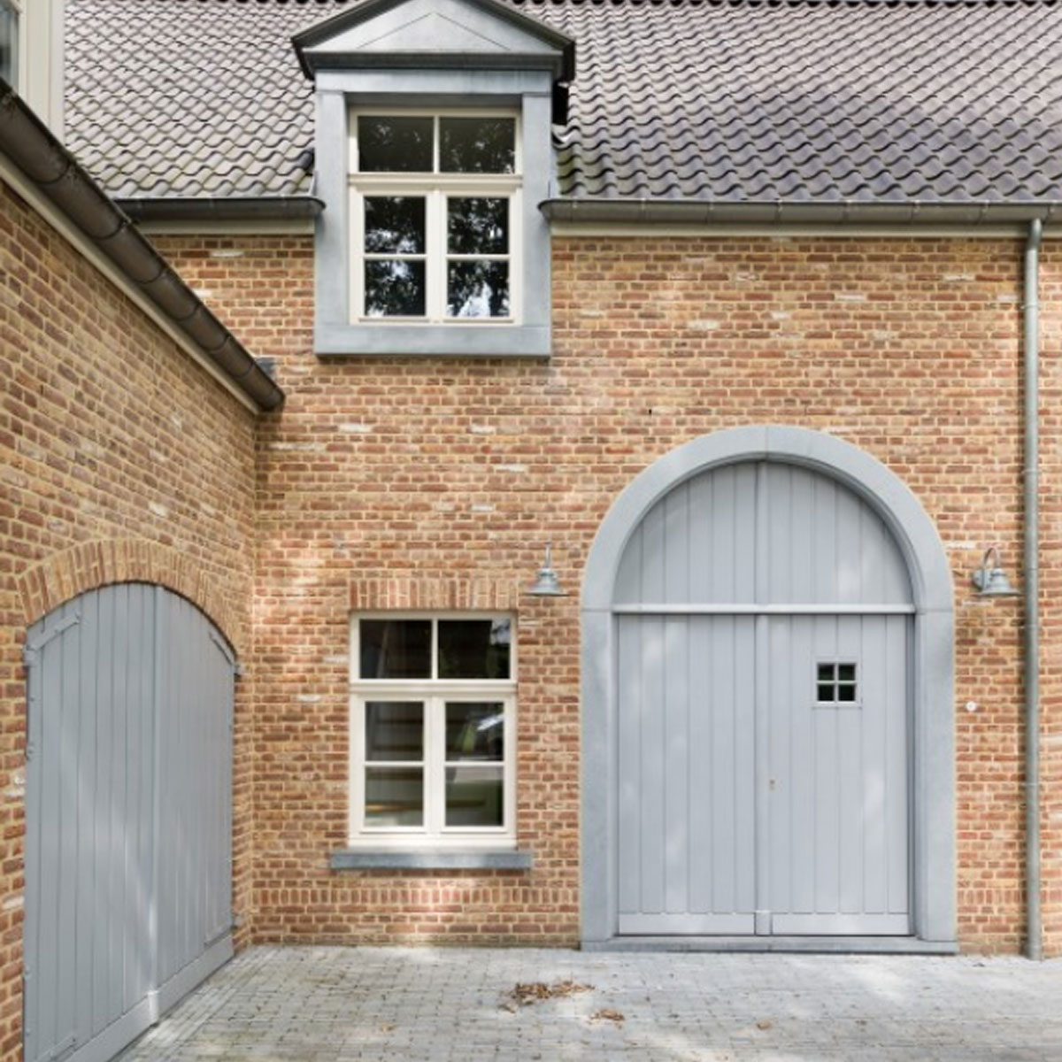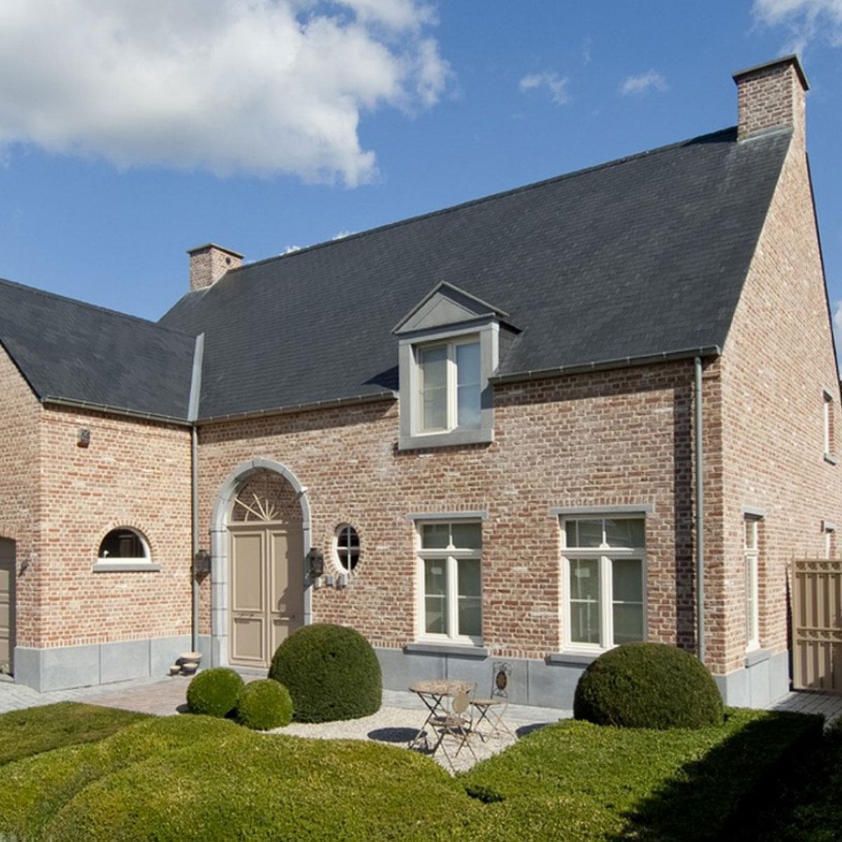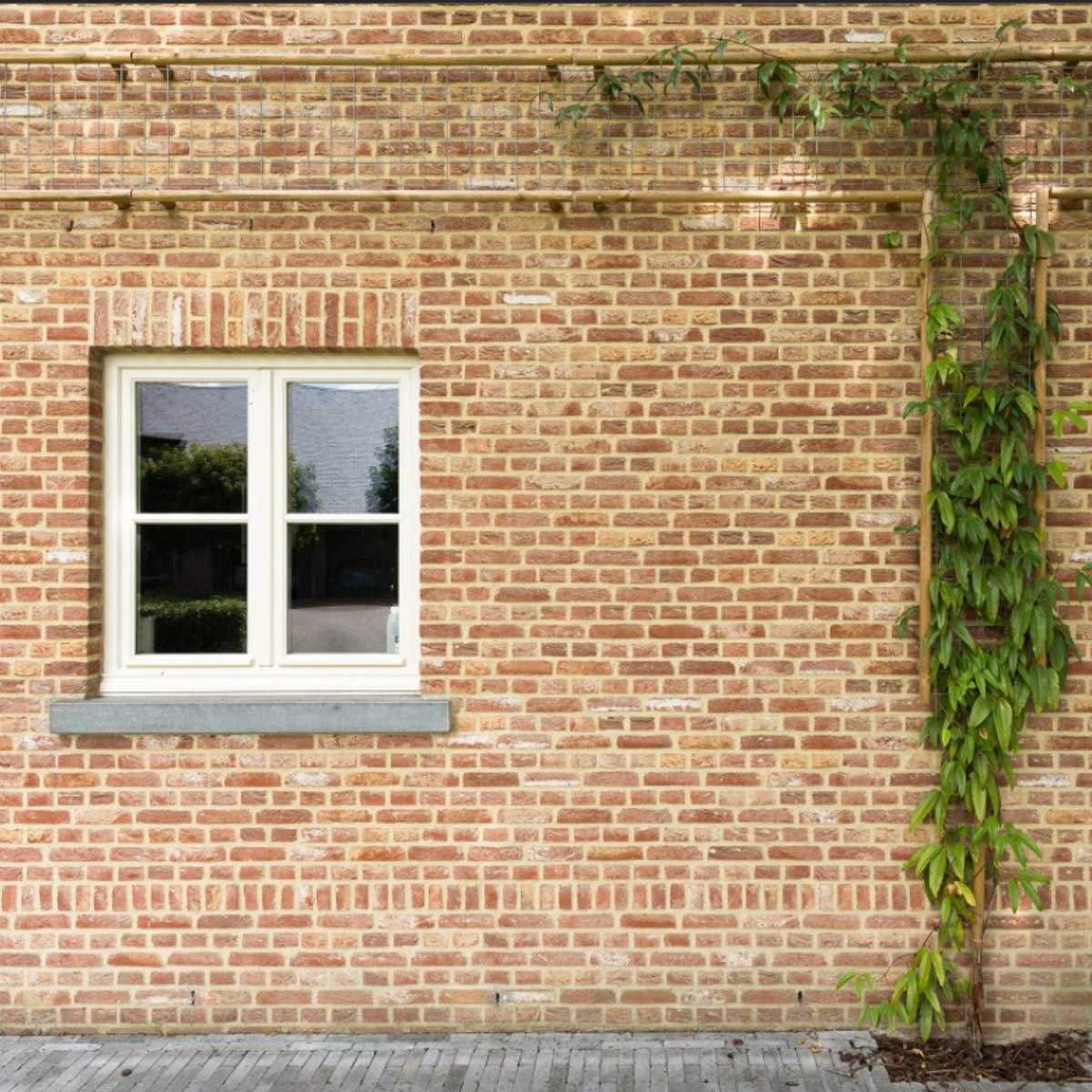 This hand-molded facing brick has a red base, with hues ranging from orange red with white-beige shadings, to vivid red with black spots.
