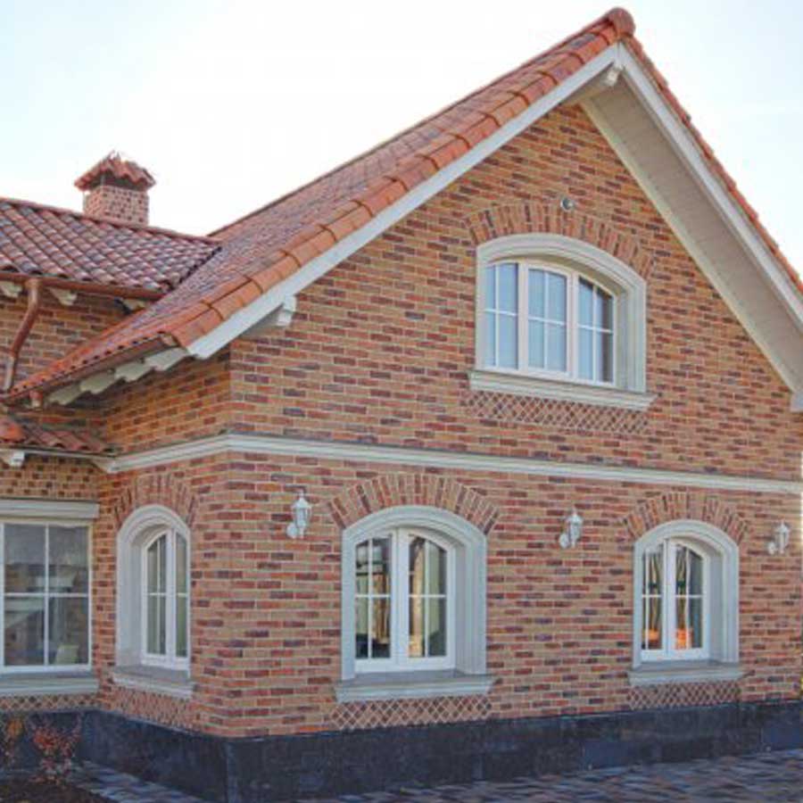 This hand-molded facing brick has a red base, with hues ranging from orange red with white-beige shadings, to vivid red with black spots.