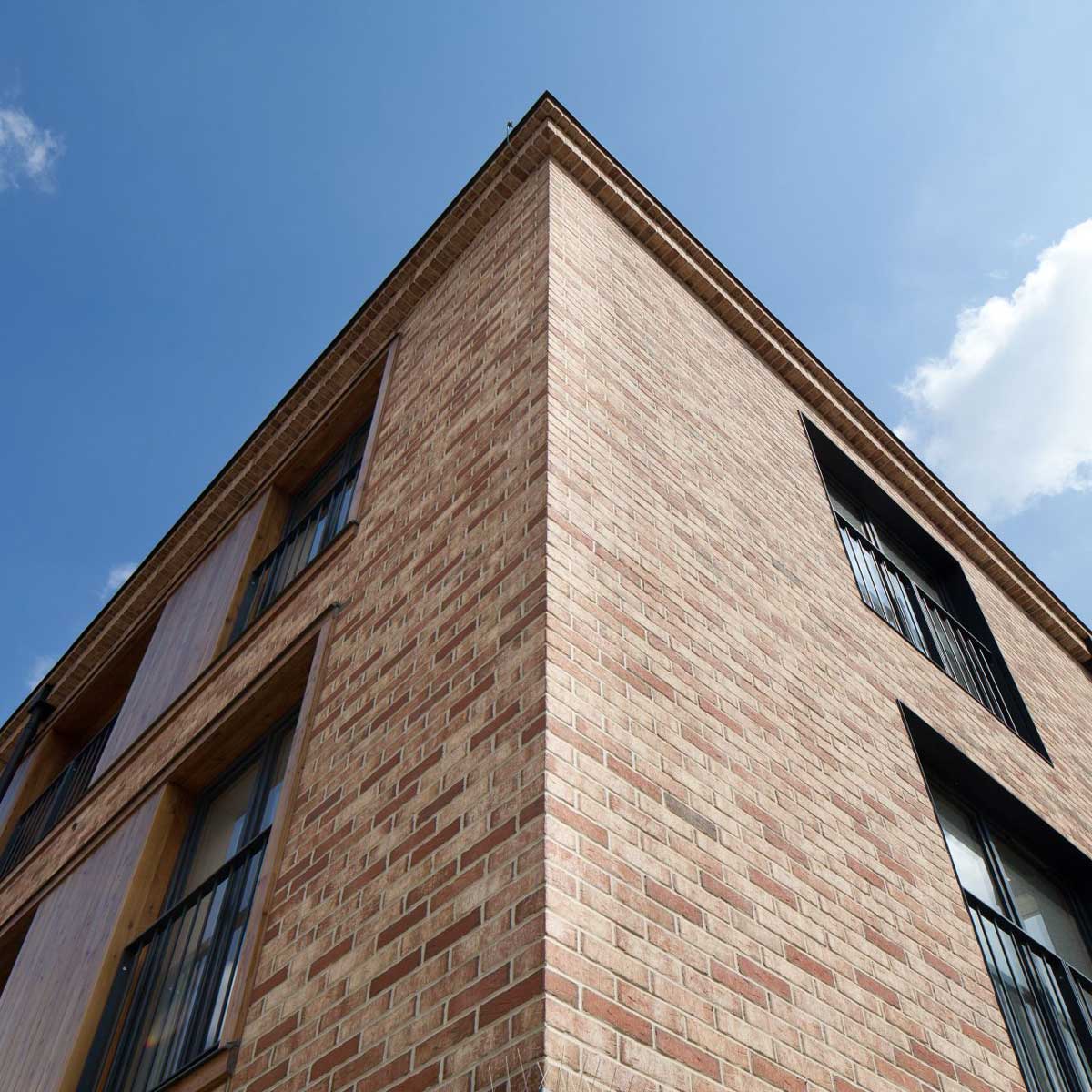 Thin bricks are – like facing bricks – coarse-ceramic products that are formed of natural raw materials and fired at temperatures of approx. 1,150 °C. At Feldhaus, the thin bricks are not cut from whole bricks but are manufactured directly in the appropriate thickness. This also applies to the corners, which are pressed into an angular shape to match the size. Natural resources are preserved, and the environmental friendliness of this building material is reaffirmed.