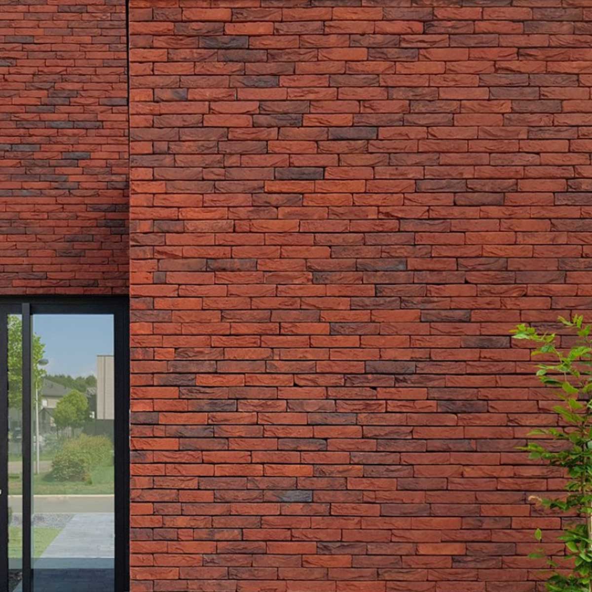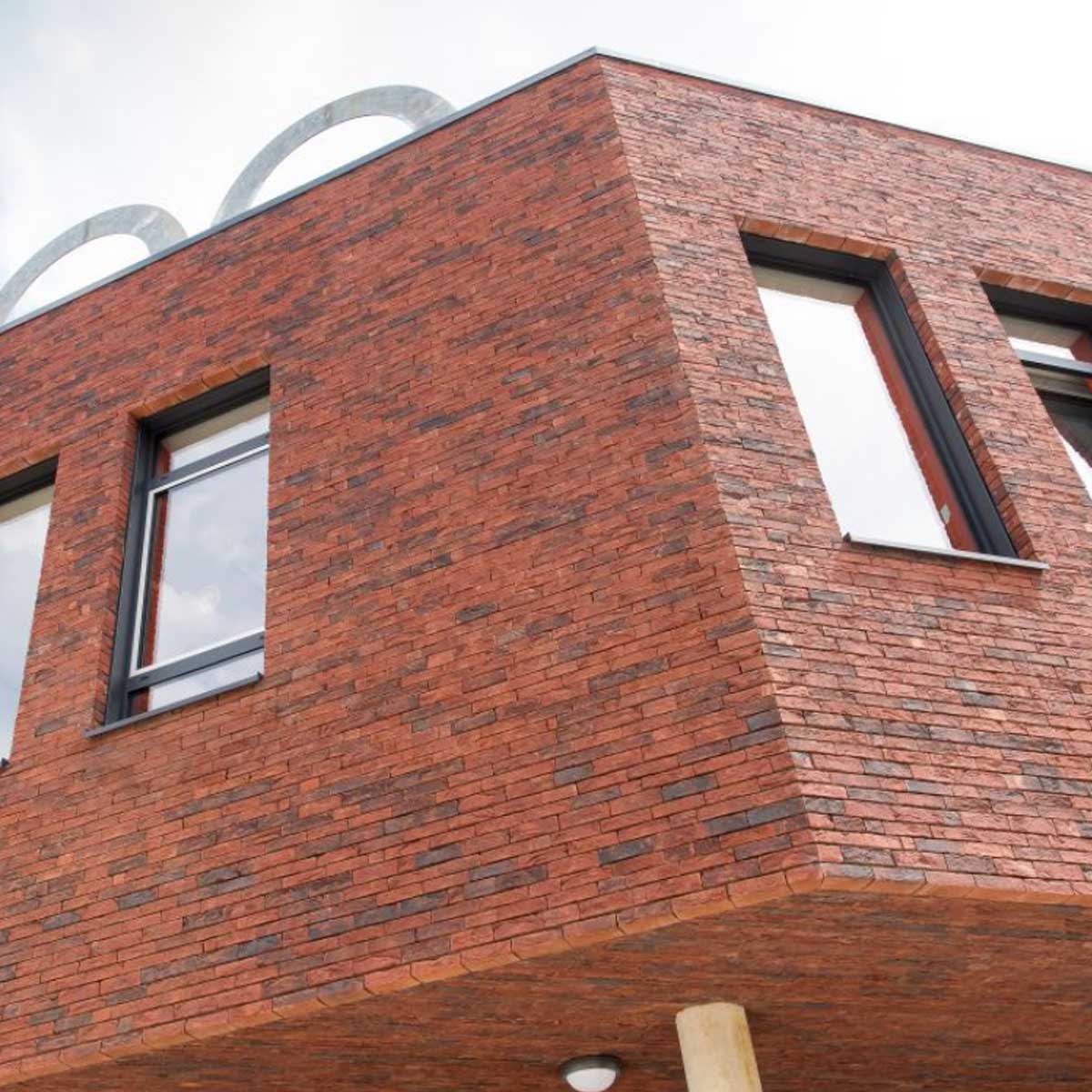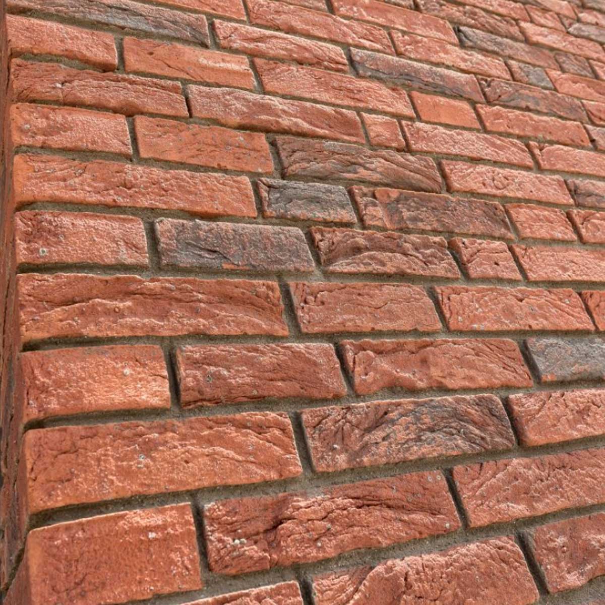 This hand-molded facing brick has a red base, with hues ranging from orange red with white-beige shadings, to vivid red with black spots.