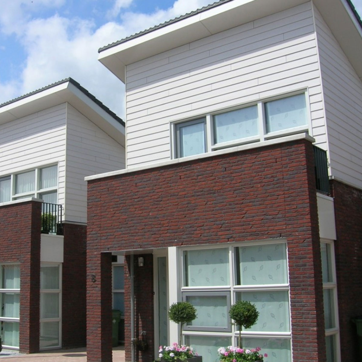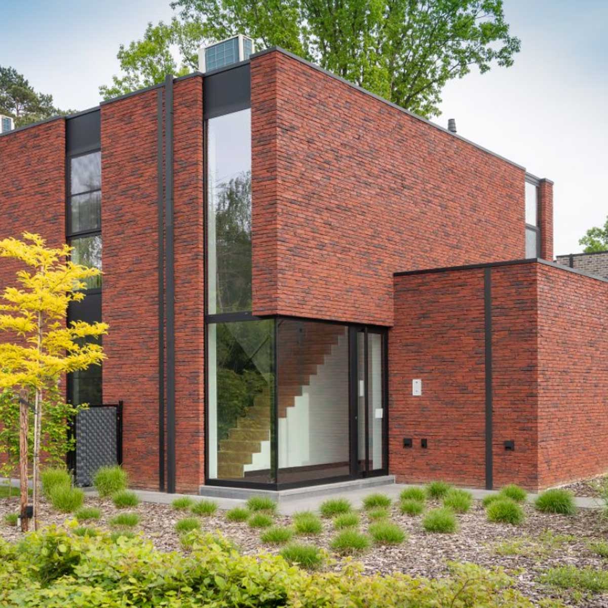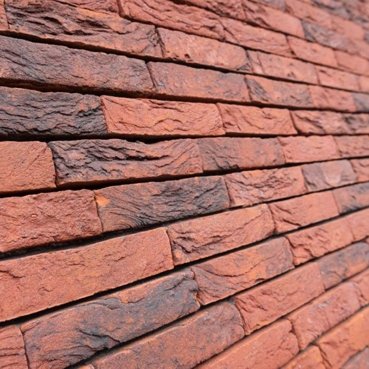 This hand-molded facing brick has a red base, with hues ranging from orange red with white-beige shadings, to vivid red with black spots.