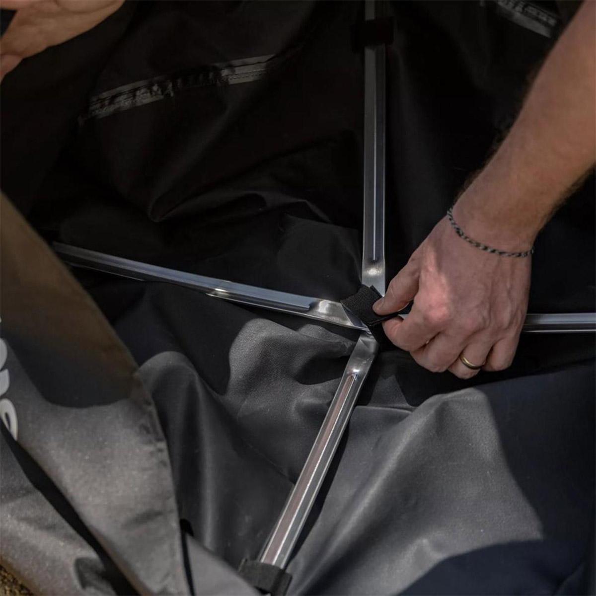 Shelter is made with PVC-coated polyester, the same material used to make whitewater rafts. The domed top is supported with 3mm thick reinforced aluminum stays.