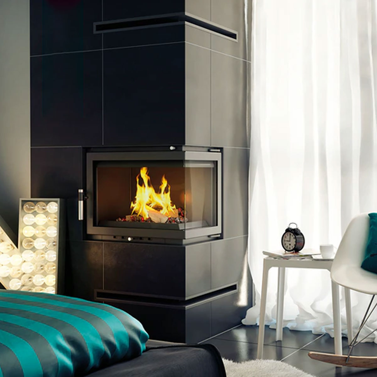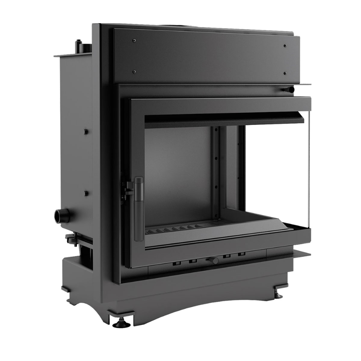 A fireplace insert with two panes compiled with each other at angles (without brackets).