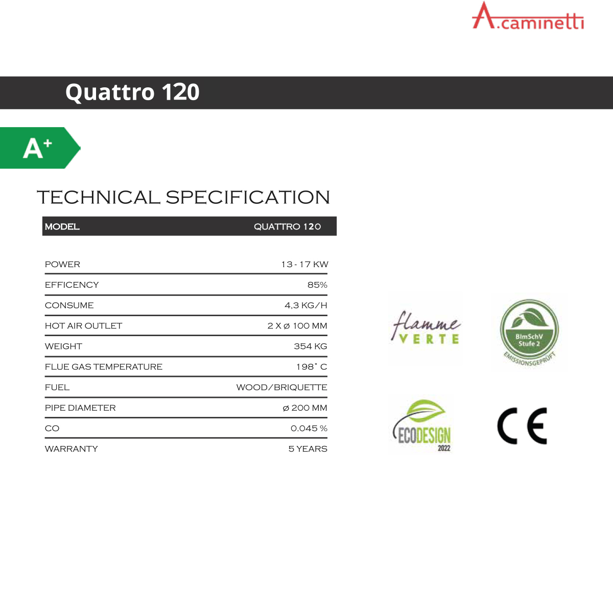 A.caminetti has chosen to adapt the design of its stoves and fireplaces for several years now, so that they already comply with the envisaged parameters. This is why a large number of models already exceed the minimum requirements in terms of efficiency and emissions set by Ecodesign regulations.