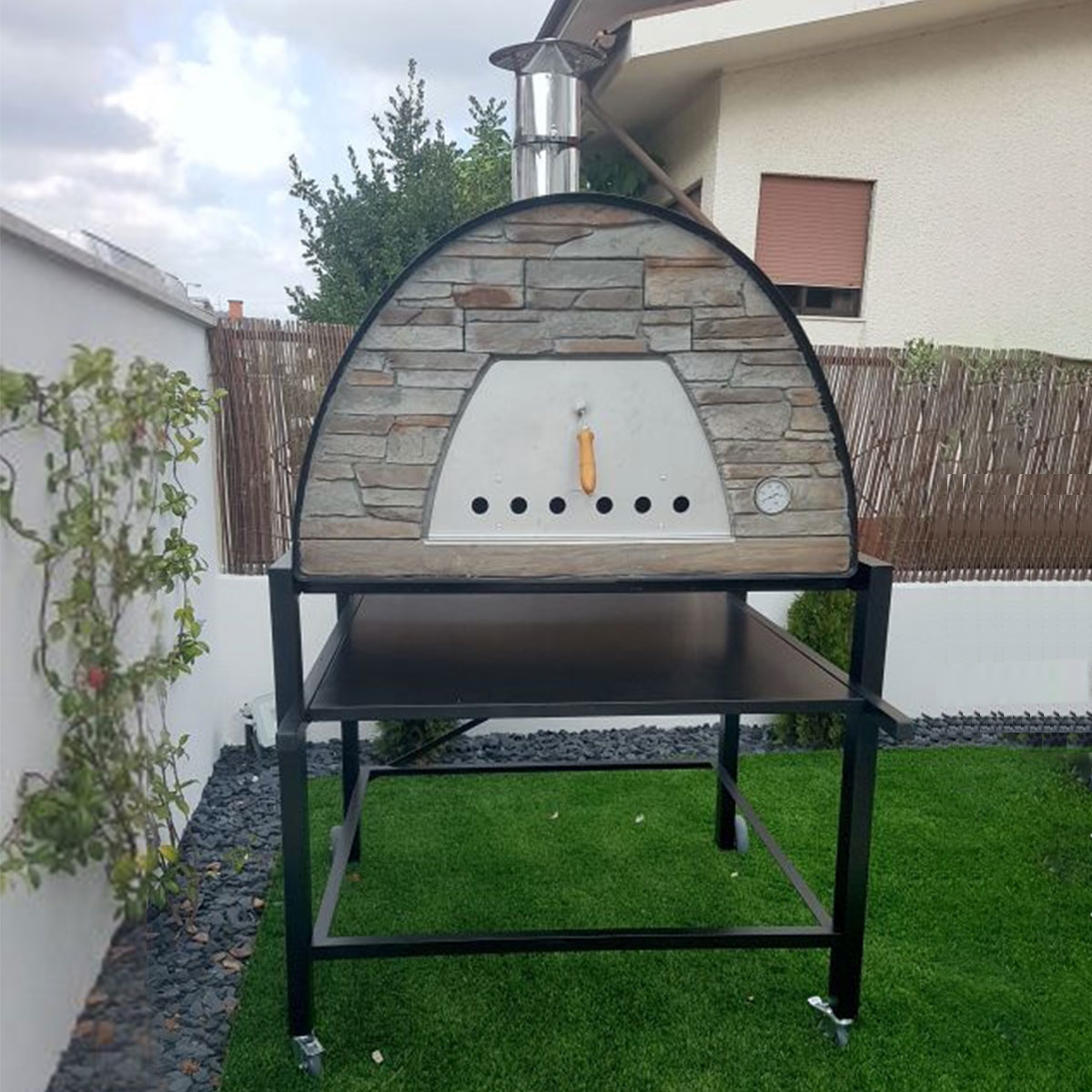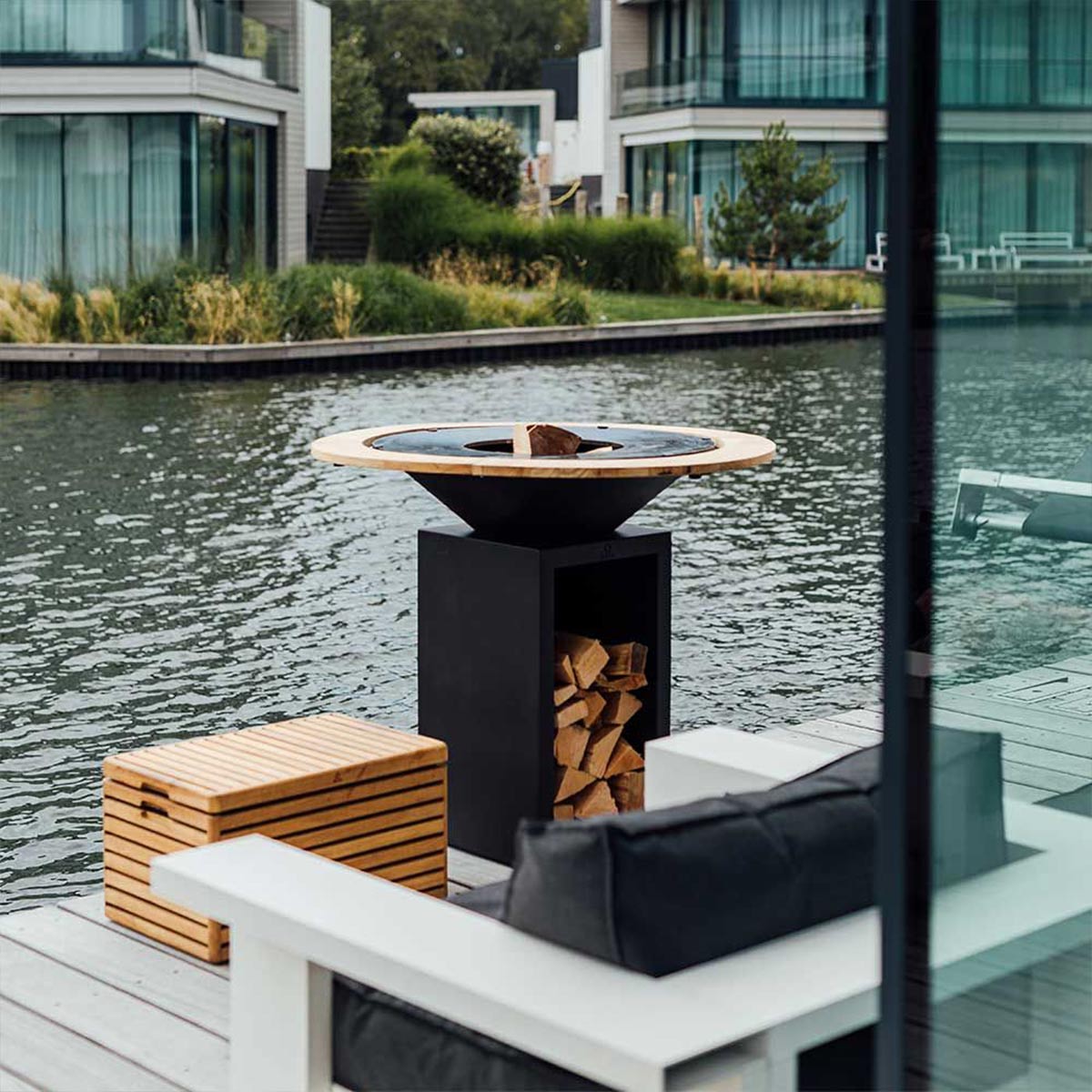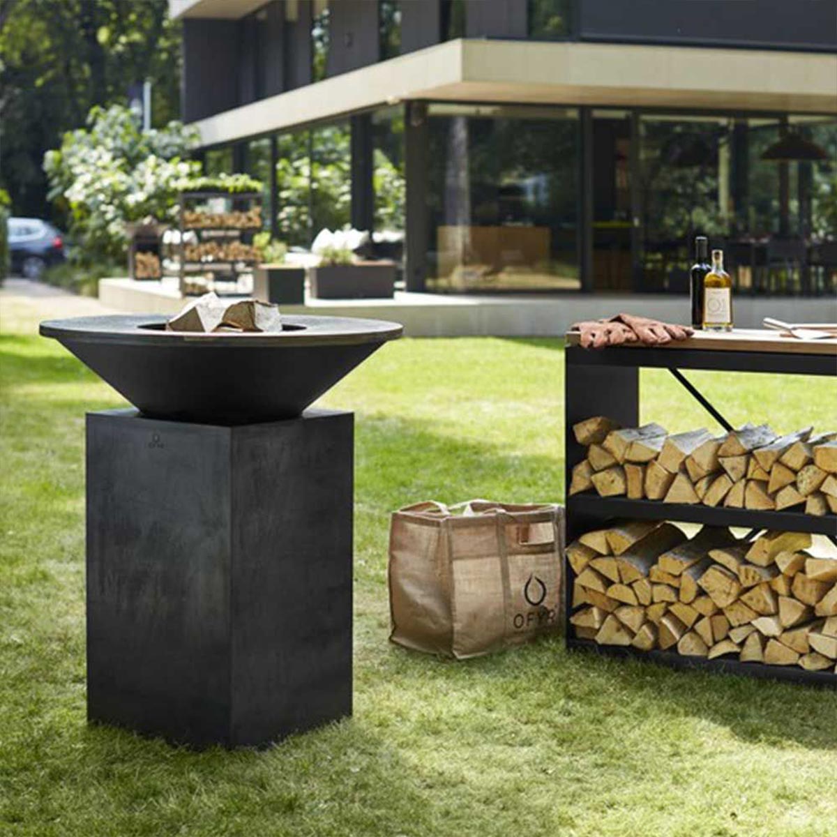 Outdoor cooking unit features integrated storage space, offering convenient access to cooking essentials.