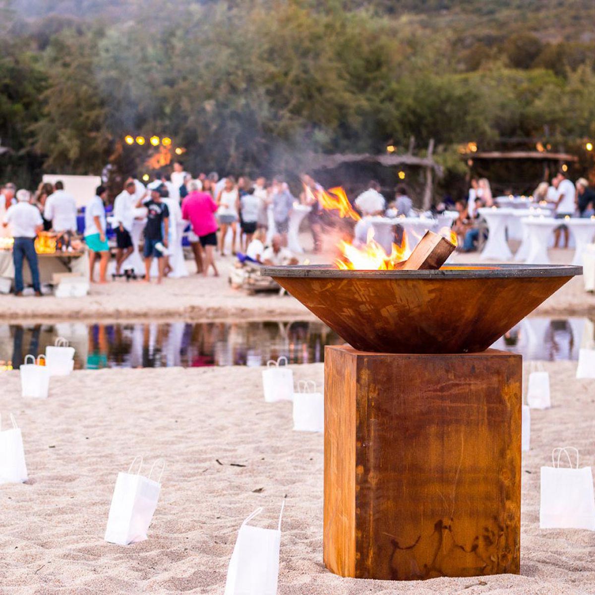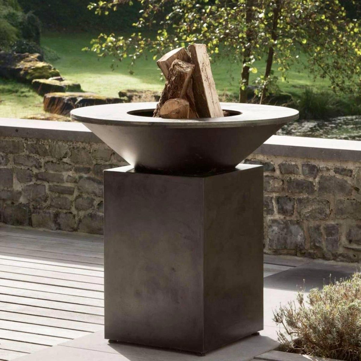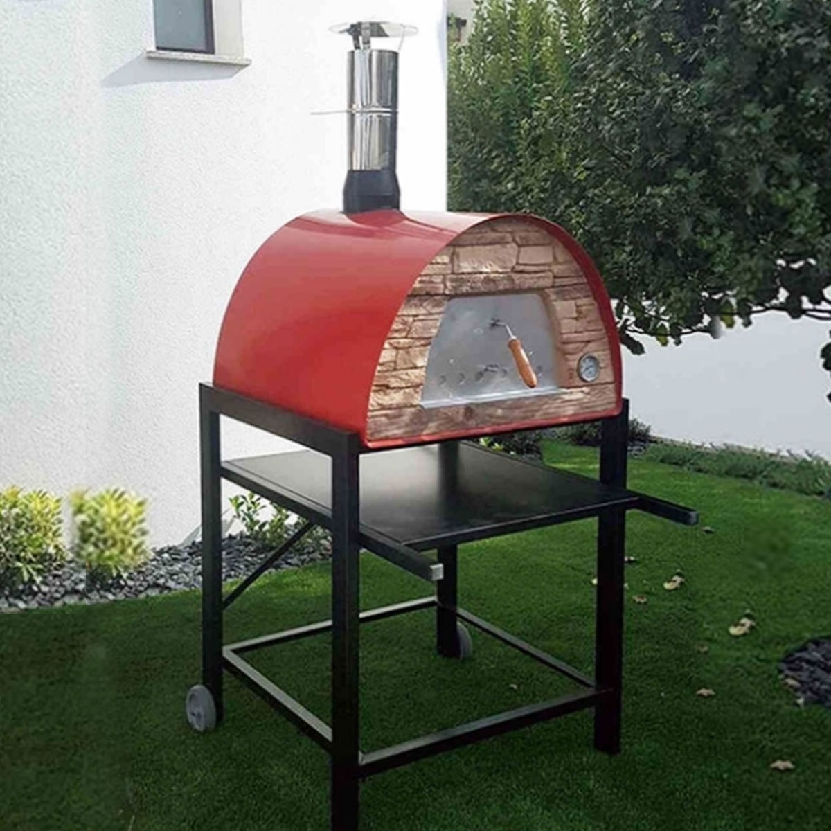 Outdoor cooking unit features integrated storage space, offering convenient access to cooking essentials.