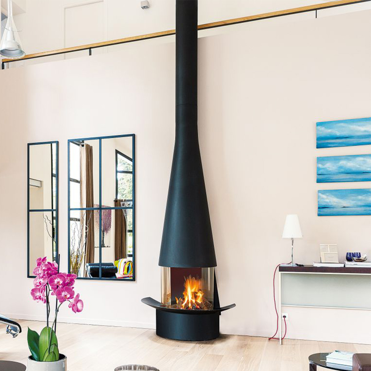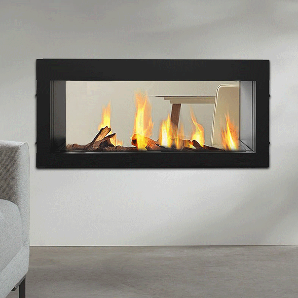 Wall-mounted gas fireplace that provides efficient heating and a stylish, contemporary focal point.