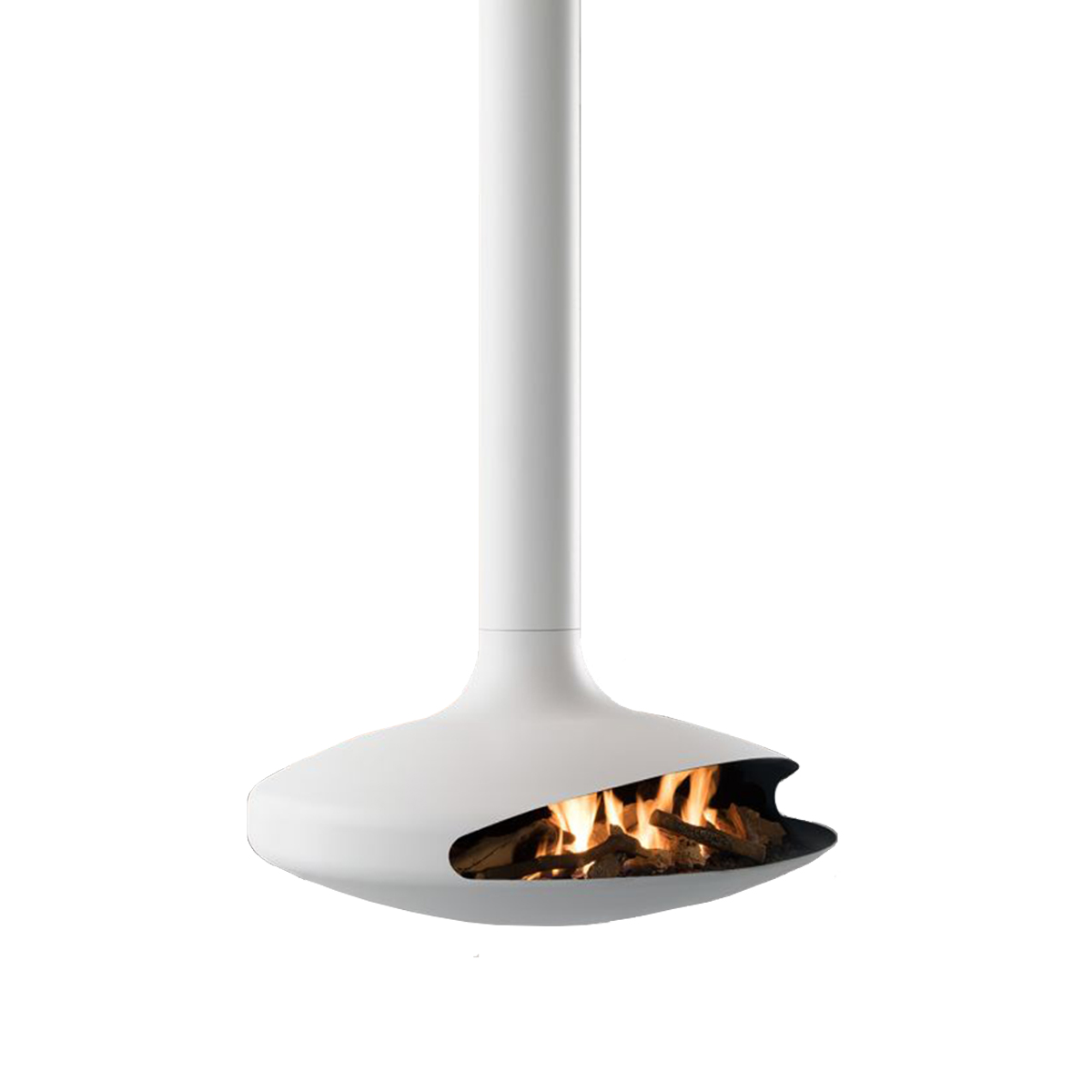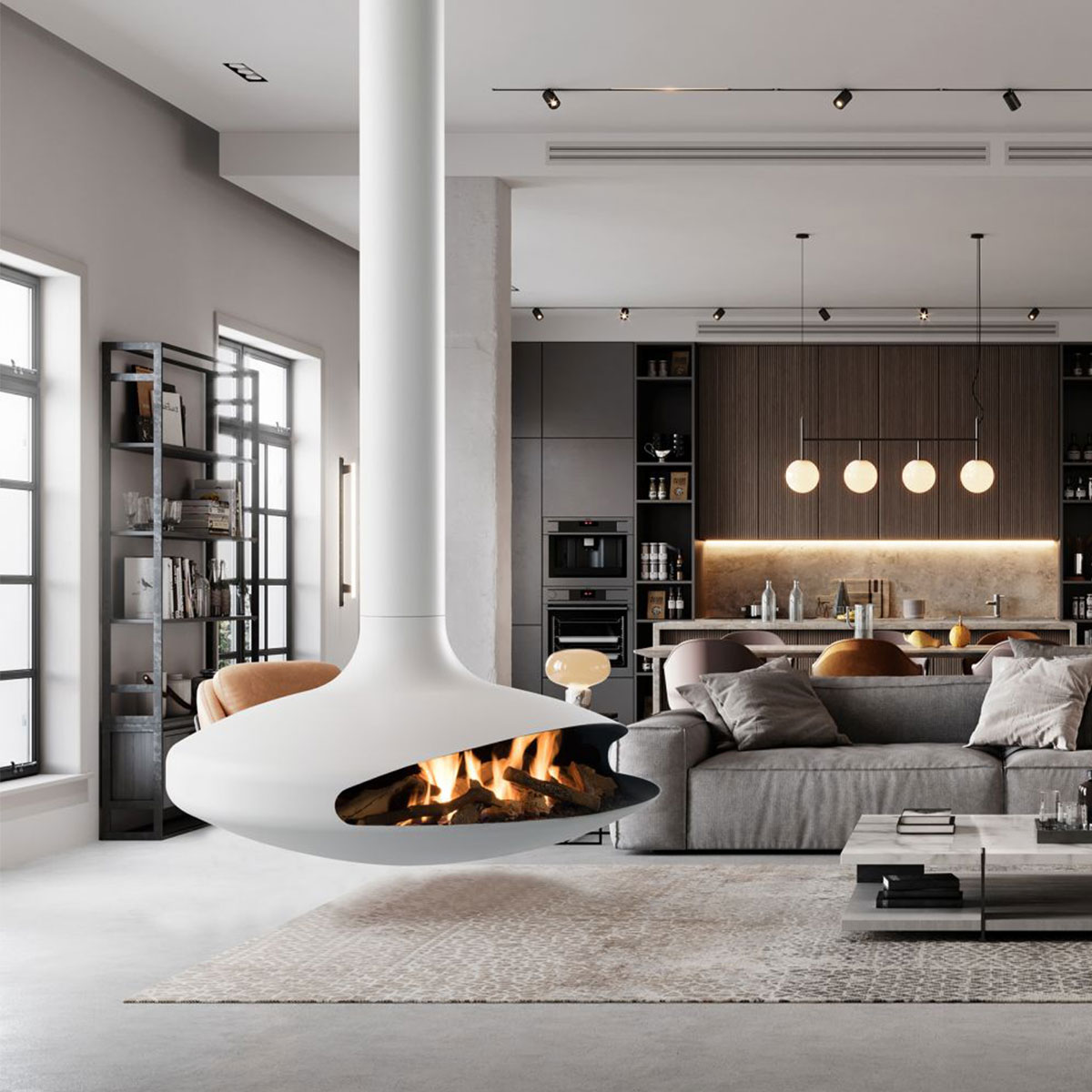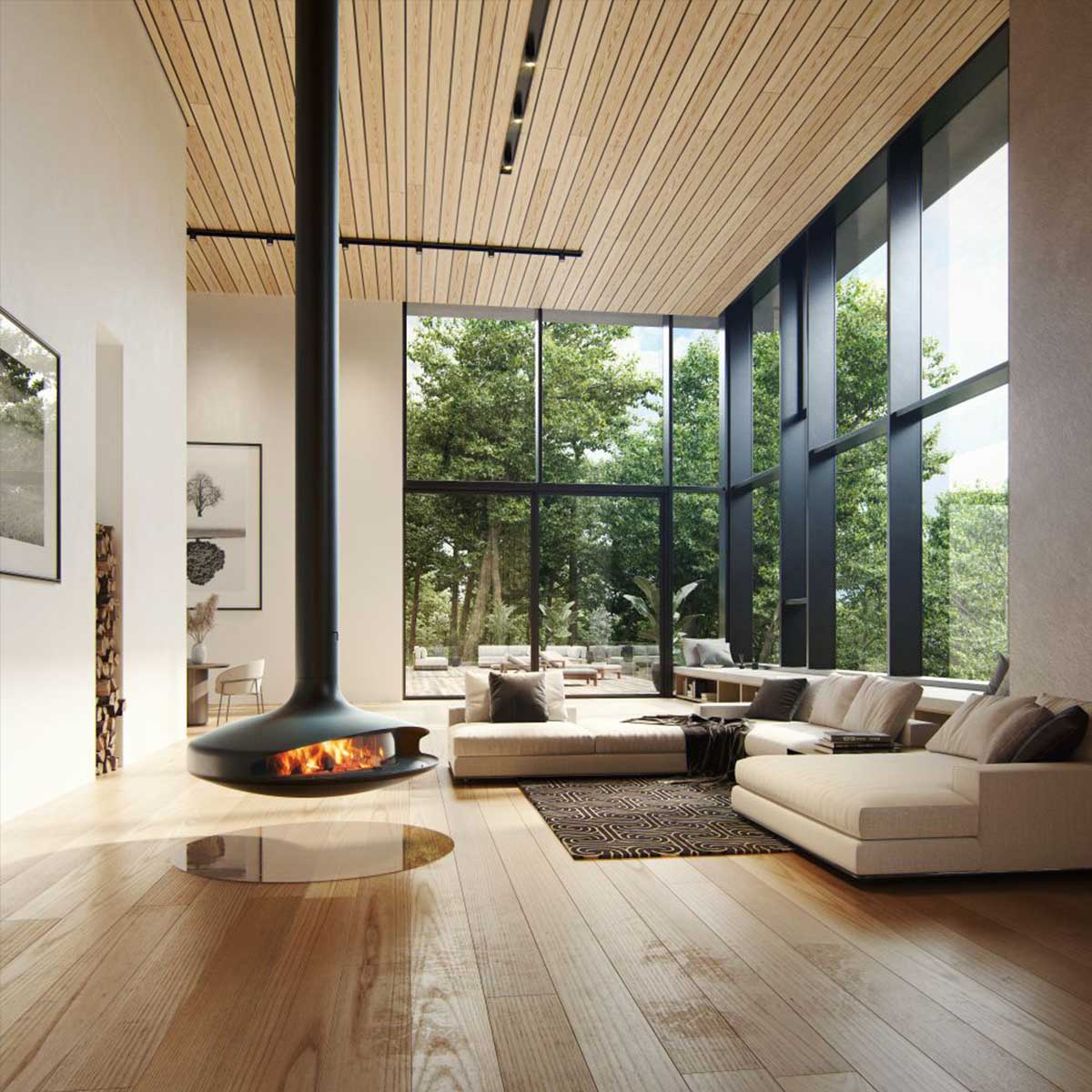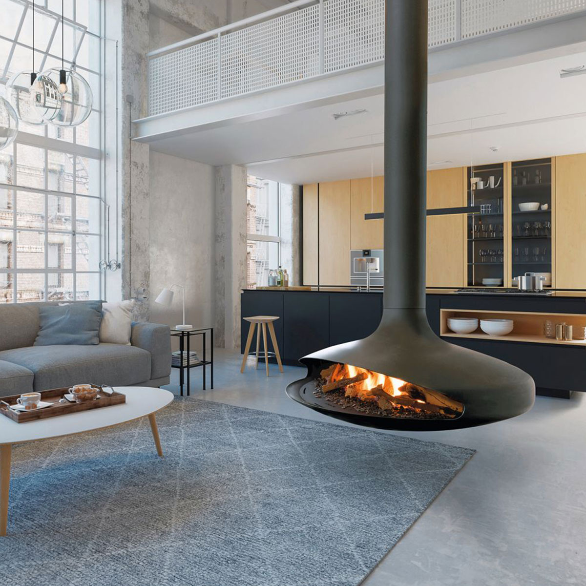 Central glazed wood fireplace with suspended and pivoting hearth.
