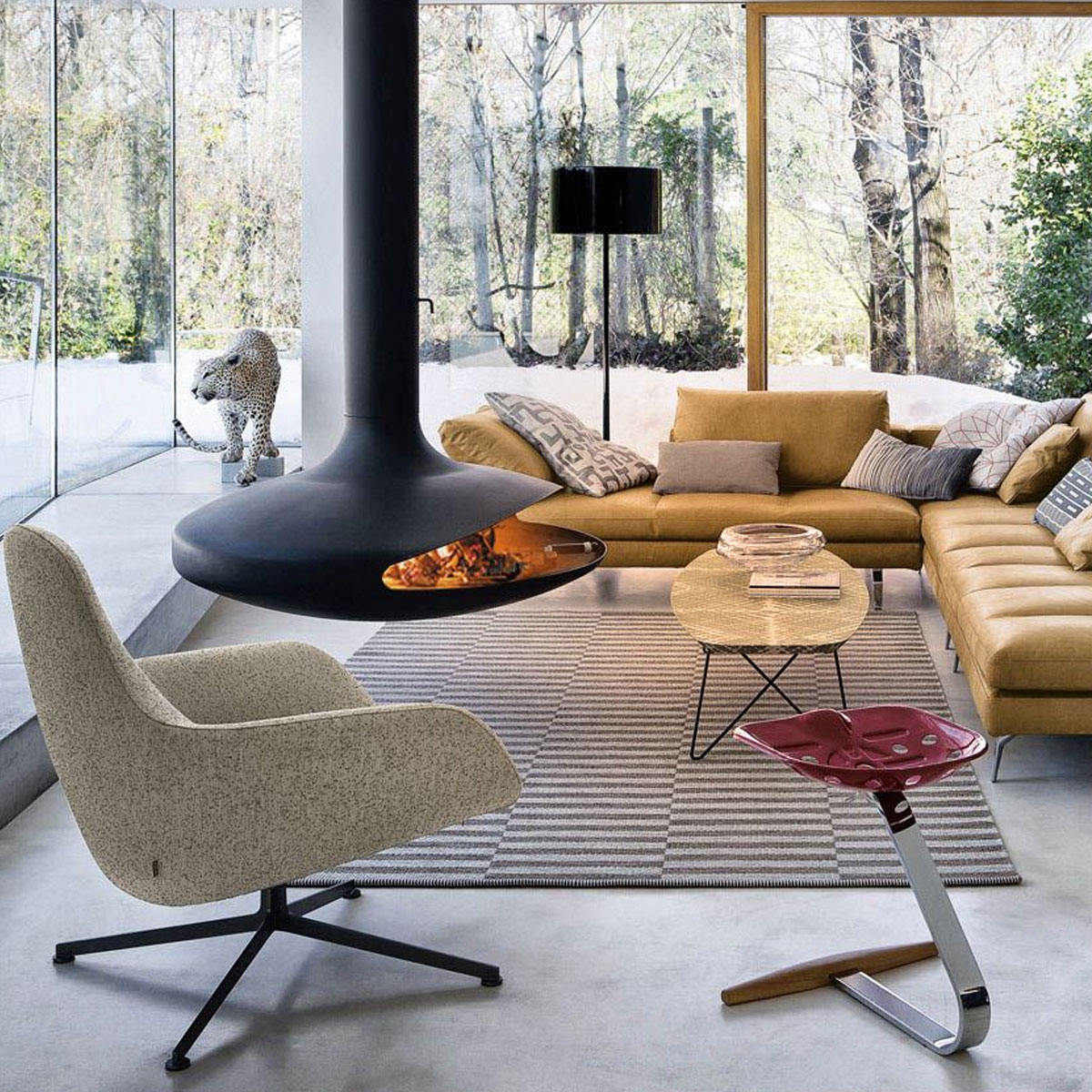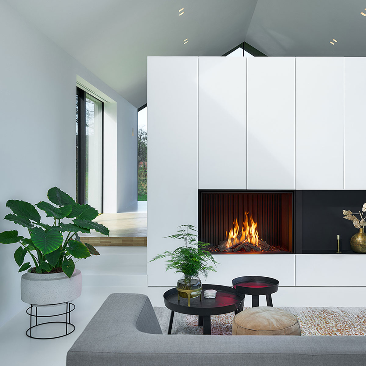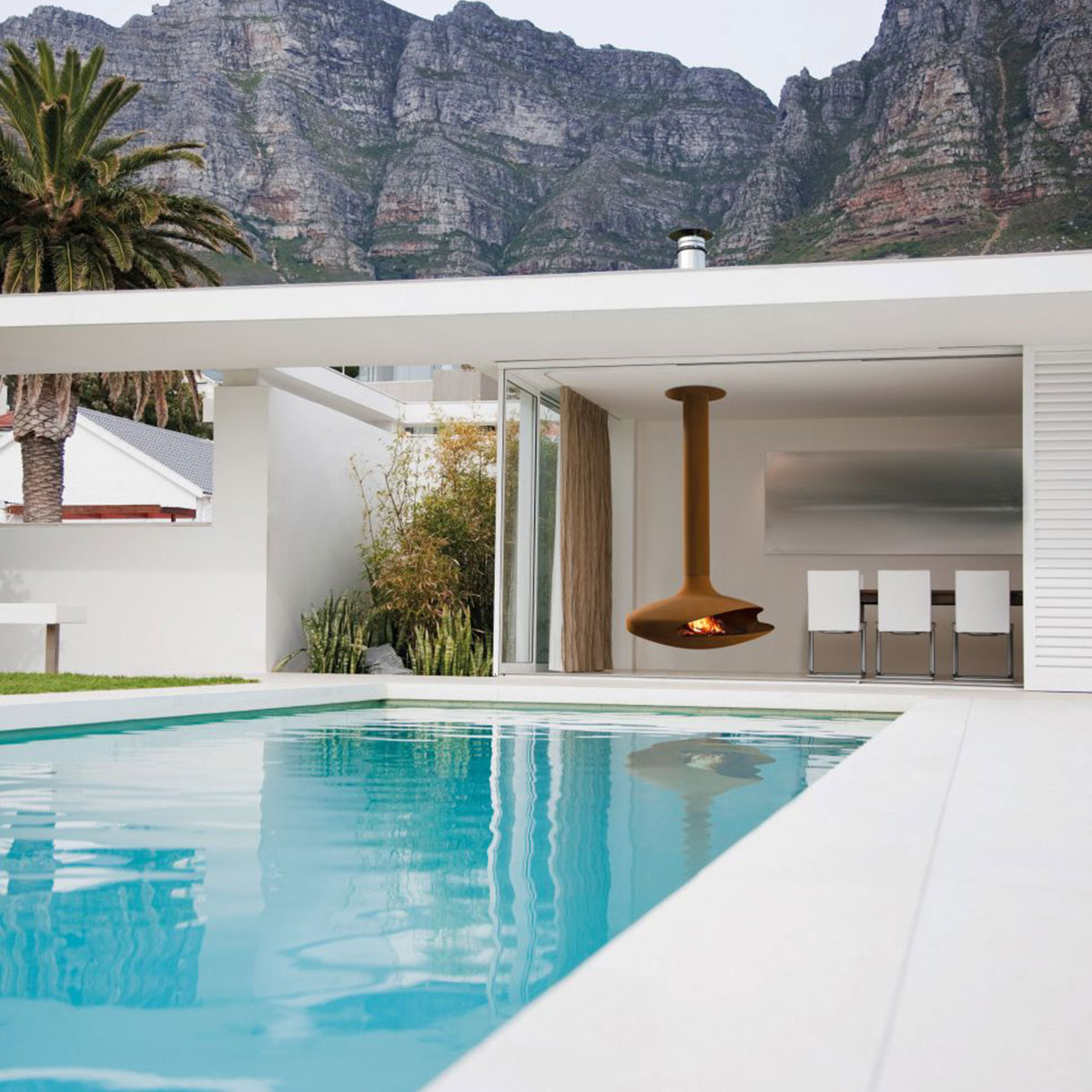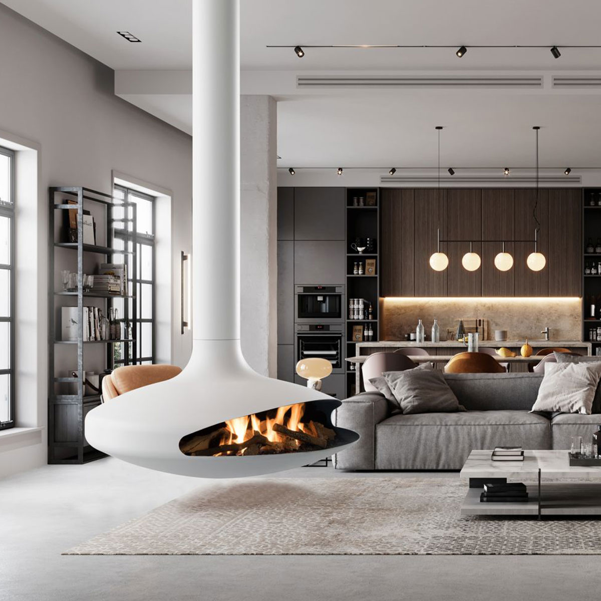 Central glazed wood fireplace with suspended and pivoting hearth.