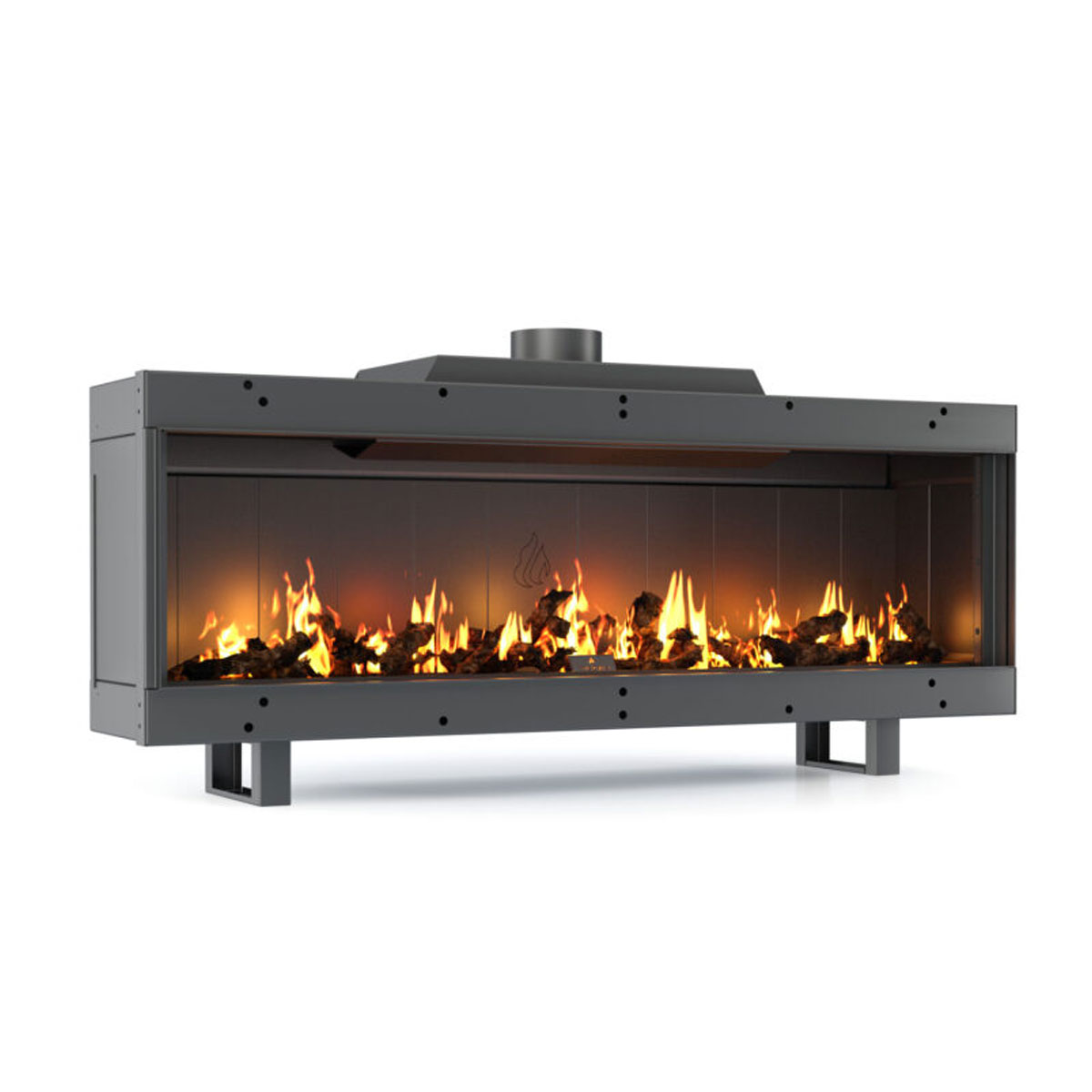 Designed to fit into a corner space, featuring an adjustable height for optimal heat distribution and visibility.