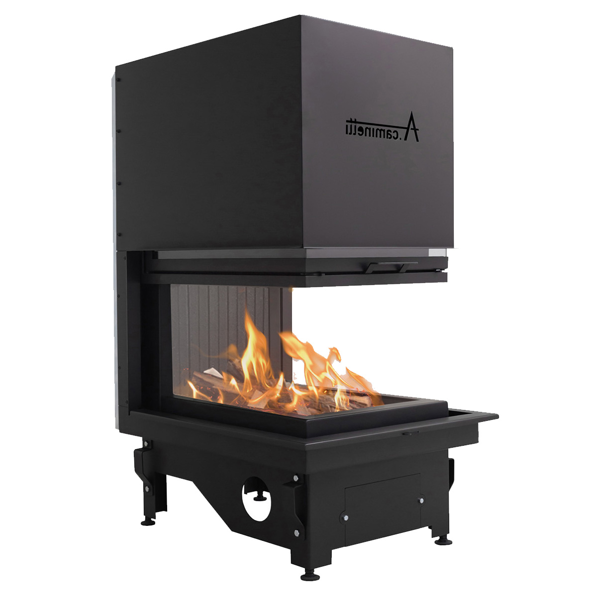 Designed to fit into a corner space, featuring an adjustable height for optimal heat distribution and visibility.
