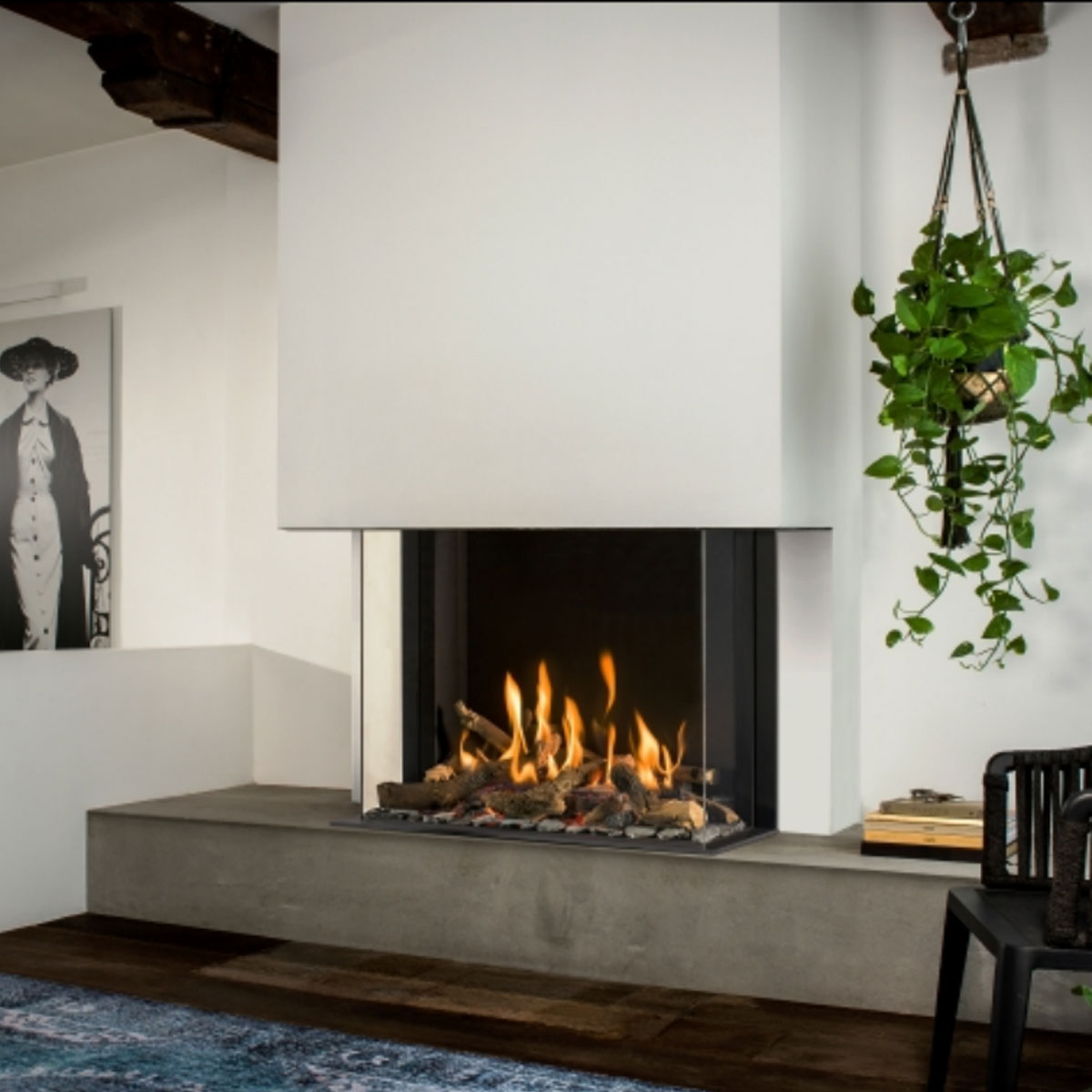 Compact and stylish corner fireplace, ideal for modern interiors, offering efficient heating.